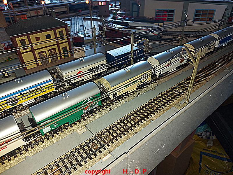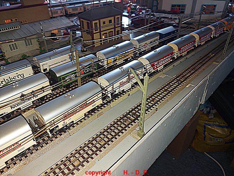 54 dieser Bierwagen stammen von Märklin und 2 von Fleischmann und die Loks stammen von Mehano, Märklin und Piko