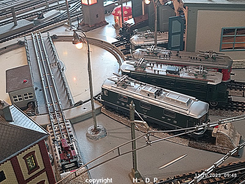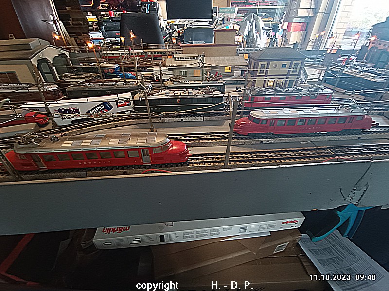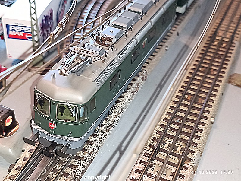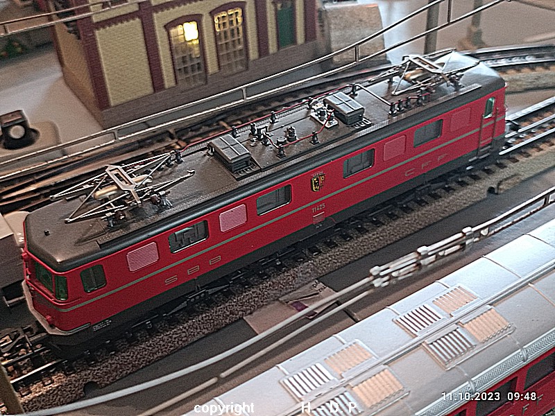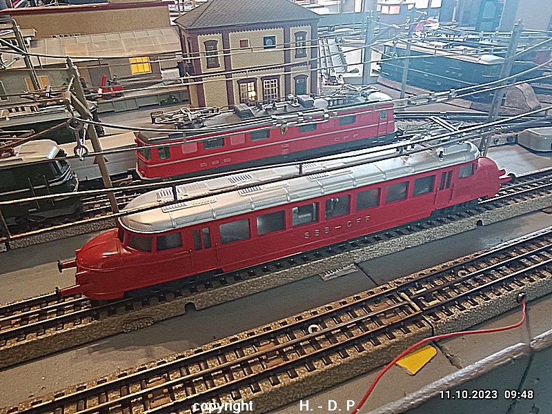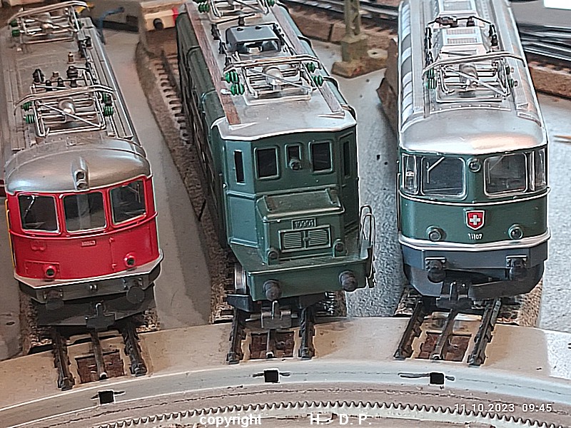 Der heutige Spieltag stand unter dem Motto " mal wieder Schweizer Käse, ach nee Schweizer Tage in Heinhausen " Ich habe fast alle meine Loks nach Schweizer Vorbild aus den Vitrinen zusammengesucht und auf die Platte gestellt und auf der Platte habe ich Platz für insgesamt 20 Loks. Zuerst fuhren Schweizer Triebwagen und zwar 2 x Roter Pfeil und ein Triebwagen mit Steuerwagen. Bei der nächsten Runde kamen Schweizer E - loks zum zuge und daruter die braune Doppellok der BLS.