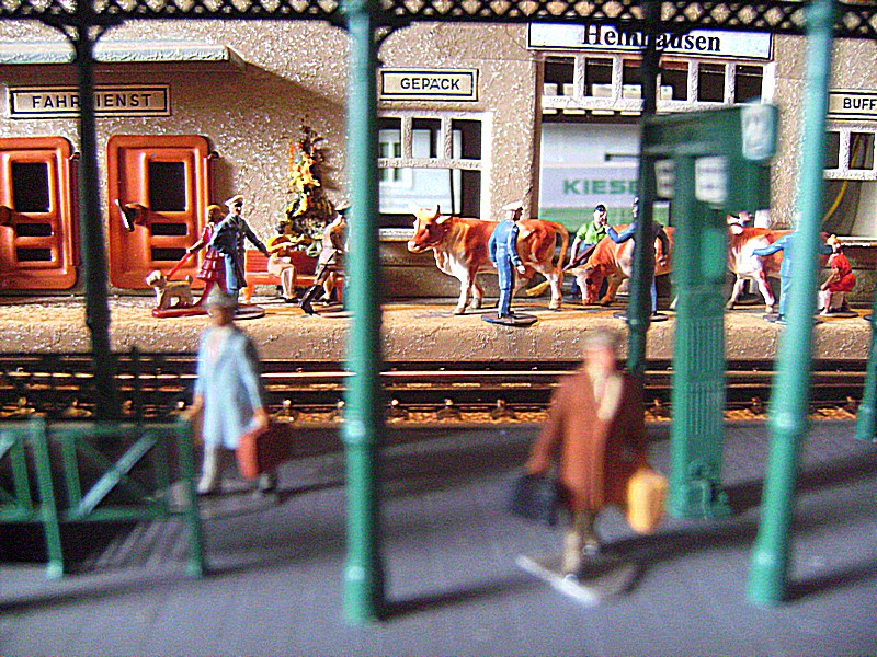 Oma und Opa Lustig saßen auf der Bank und schauten dem lustigen Treiben zu. Herr Peters hatte seinen Sohn Peter auf die Schulter genommen, damit er nicht unter die Hufe kam, während die Stallhelfer Gustav Knute und Freddy Besen die Hinterlassenschaft der Kühe beseitigten, denn man wollte den Bahnhof ja sauber halten. Erich Milchkanne dagegen schleppe eine Kanne nach der anderen ans Gleis und kippe die Milch dort aus.