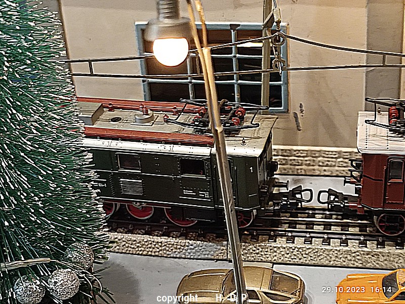 Dazu kam noch der kleine Kittel Dampftriebwagen mit 3 Güterwagen der Fleischindustrie und eine Lok der BR EP 2 der DRG mit neuen Donnerbüchsen aus der 4100 Serie. Alle Loks und Wagen stammen aus dem Haus Märklin. Diese Züge drehten ihre Runden im bereits heute vorweihnachtlich geschmückten Heinhausen.