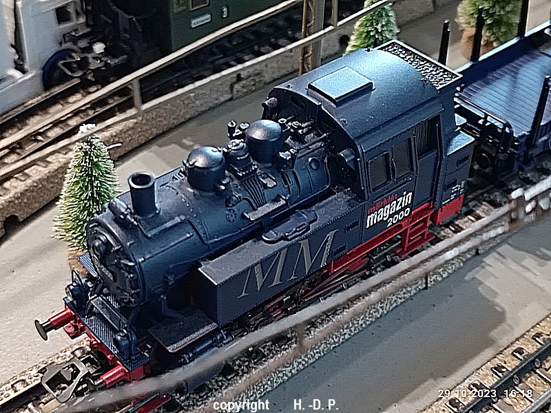Der heutige Spieltag steht unter dem Motto "Allerlei im vorweihnachtlichen Heinhausen" Dazu habe ich mal einige Loks und Wagen au den Vitrinen, bzw. Stapelboxen genommen, die sonst nur selten bis fast gar nicht auf der Anlage zu sehen sind. Da dieser Spieltag ja schon in der Vorweihnachtszeit spielt, durfte natürlich auch die neue kleine umlackierte 3029, welche ich am letzten Freitag als Platzhalter für die neue Märklin Weihnachtslok von meinen MIST 47 Leuten erhalten habe, nicht fehlen. Ferner kamen noch zum Einsatz meine Märklin Magazin Wagen mit der Märklin Magazin Lok und später alle MM Wagen mit einer BR 50, die kleine Dampflok aus der Packung 0050 allerdings nicht in schwarz sondern in roter englischer Farbgebung als LMS Lok.
