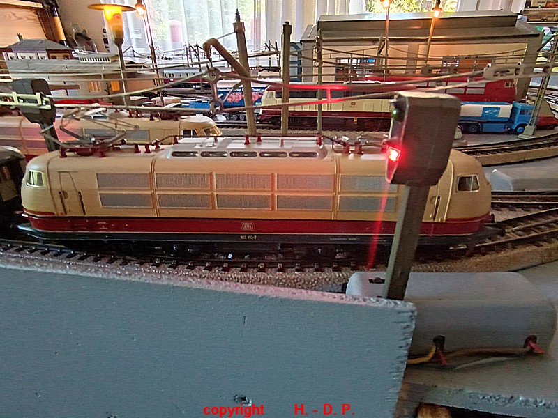 Mein Spieltag den ich Euch heute zeigen möchte stand unter dem Motto " TEE Betrieb in Heinhausen" und da war alles zu sehen was an eine TEE Farbe erinnert. Von Märklin waren dabei 2 x E 03 Art.Nr. 3053, 2 x BR 103 Art.Nr. 3054, 1 x BR 103 Art.Nr.3357, 1 x BR 103 Art.Nr. 3358, 1 x BR 120 Art Nr. 3151, 1 x RAM TEE Art.Nr. 3071, 1 x RAM TEE Art.Nr.3471 und 1 x BR 114 Art.Nr. 3033.