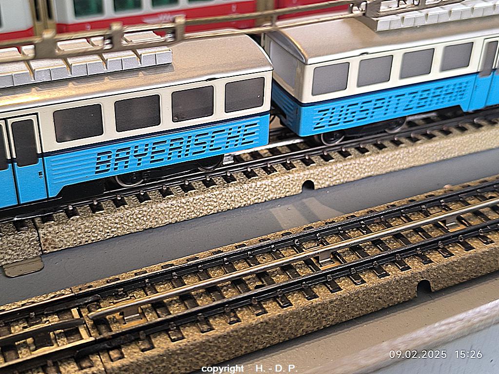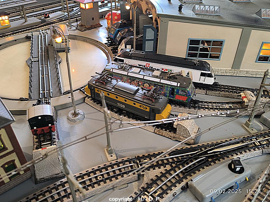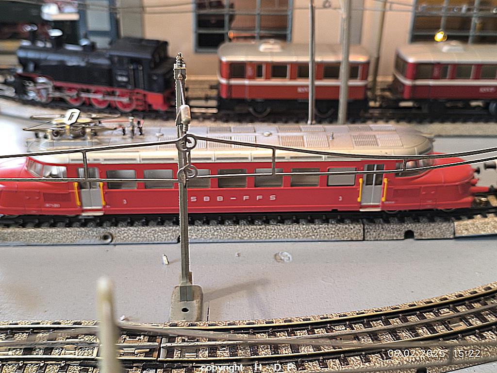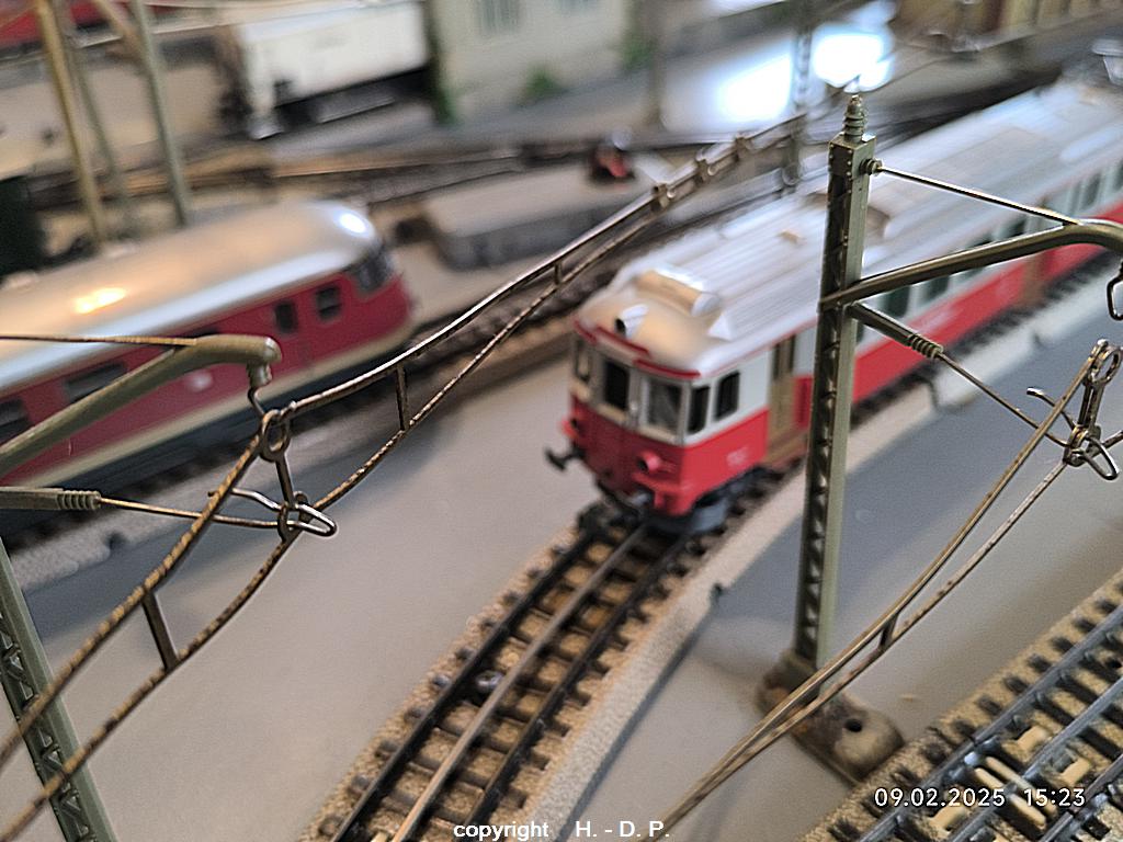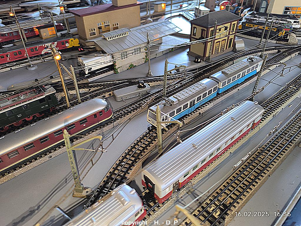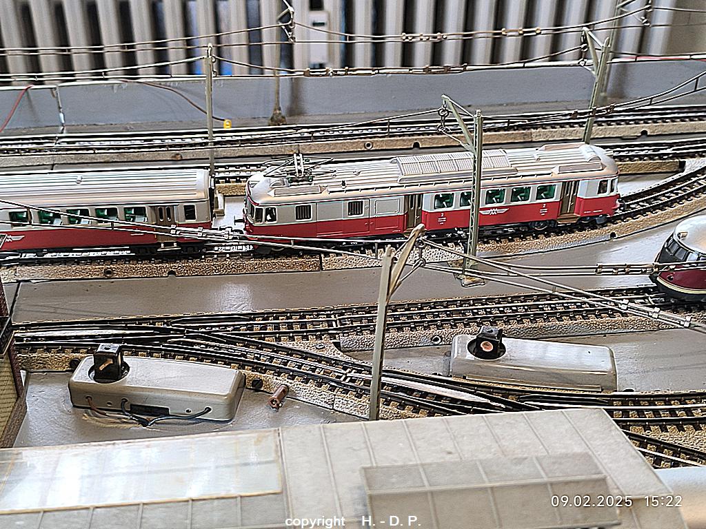 Von der Firma Hag, ein roter Pfeil und ein Trieb - mit Steuerwagen, von Märklin ein roter Pfeil, Ein Schienenzeppelin, ein Posttriebwagen der NS und von Primex die Bayerische Zugspitzbahn. In den Lokschuppen gaben sich 5 Schweizer E - Loks, eine Lok der NS und von der DB 1 x E 44.5 und eine E 32 die Ehre