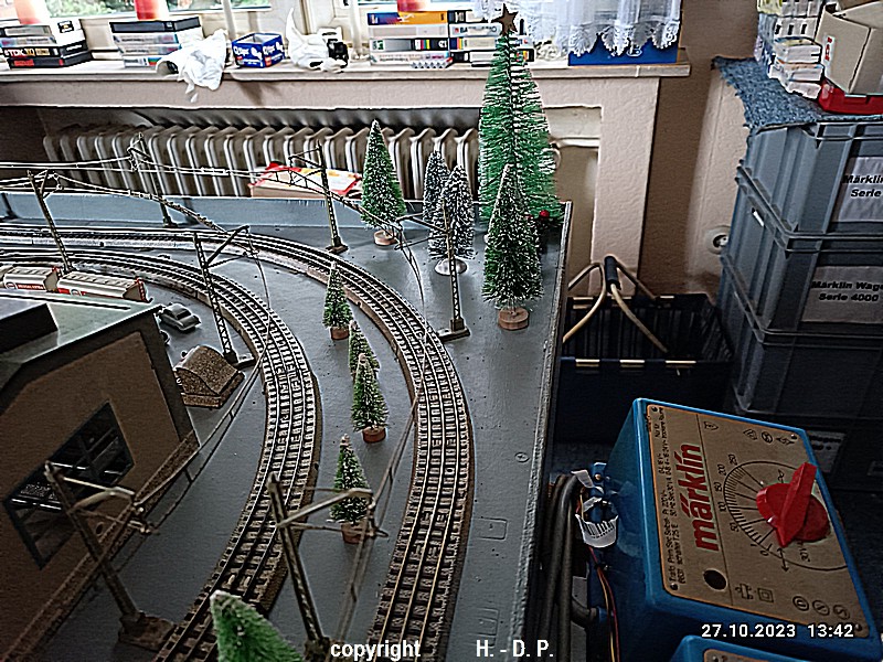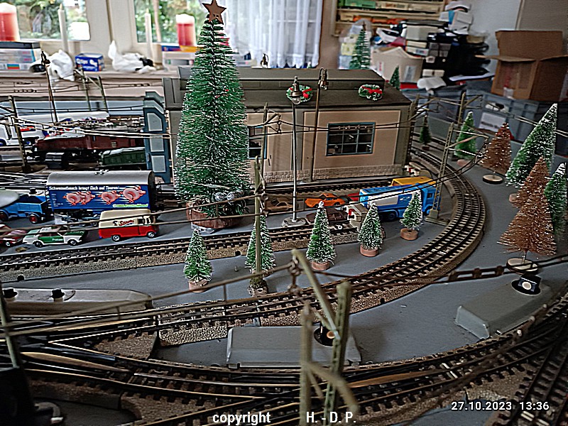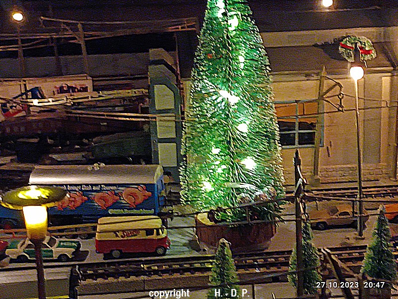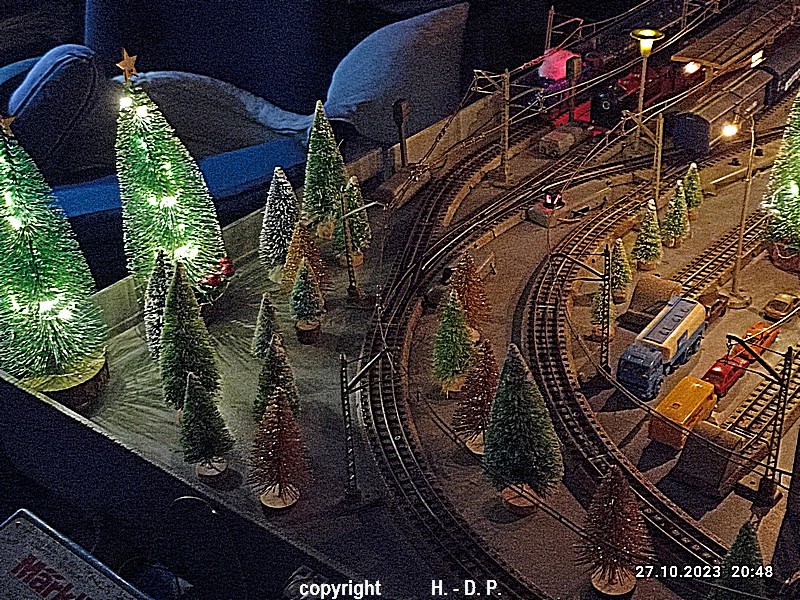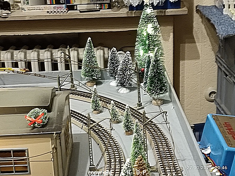 Die LED Ketten waren recht schnell an den 4 Tannen angebracht und dann wurden die mit vielen anderen Deko Tannen auf die Anlage gestellt.