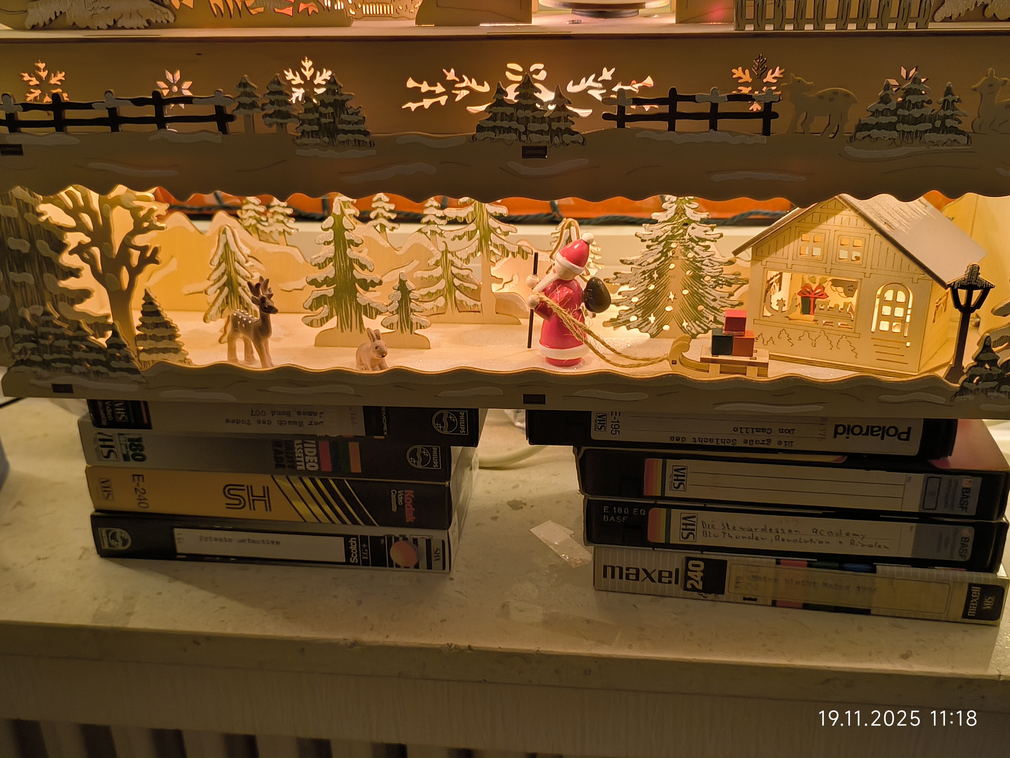 Wie man auf dem letzten Bild sehen kann, wurde in diesem Jahr wieder über die Kabel, Steckdosenleisten und Unterbau Videokassetten eine Papierabdeckung gelegt. Leider hatte meine Frau im letzten Jahr den Zeitpunkt versäumt als diese Papierrollen im Verkauf waren, denn diese Rollen sind immer in wenigen Tagen vergriffen und mit der Abdeckung sieht es nach meiner Meinung auch viel besser aus.