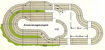 Auch bei den Fahrbahnteilen wurde an alles gedacht, so gab es Abzweigungen ein - und doppelspurig, zwei verschiedene Kurvenradien, eine Doppelkreuzung. einspurige Fahrbahnstücke, eine Engstelle und selbst  einen Bahnübergang gab es schon. Es wurde an alles gedacht.