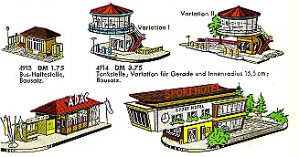 Selbst an Zubehör, wie Häuser und Verkehrszeichen hatte man bei Faller gedacht. Die Häuser stammten teilweise aus der laufenden Produktion, d.h. sie wurden nicht neu hergestellt, sondern nur mit neuen Grundplatten versehen damit die Höhe zum Straßenstück stimmte