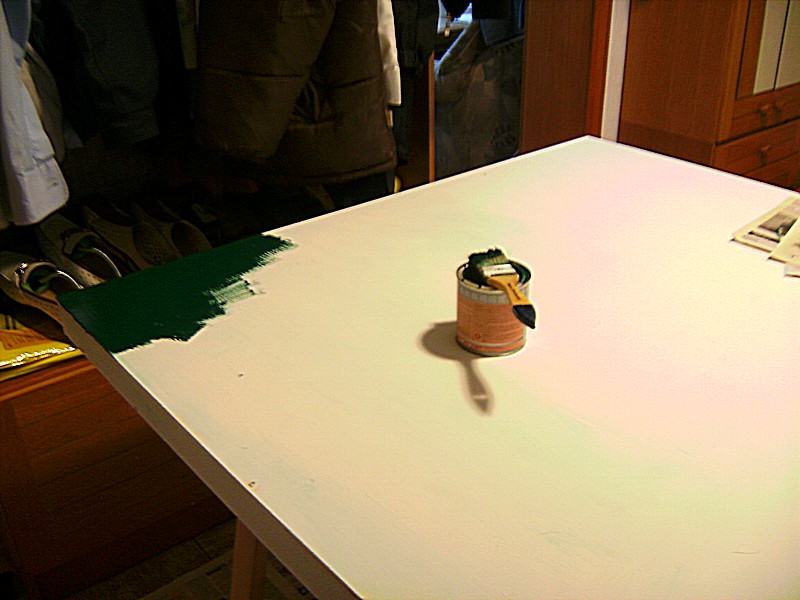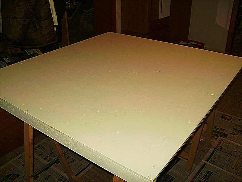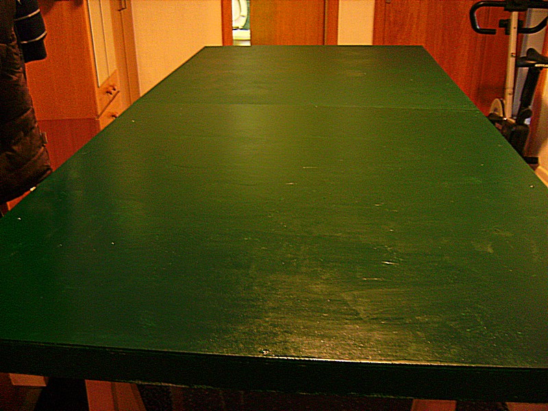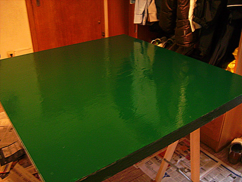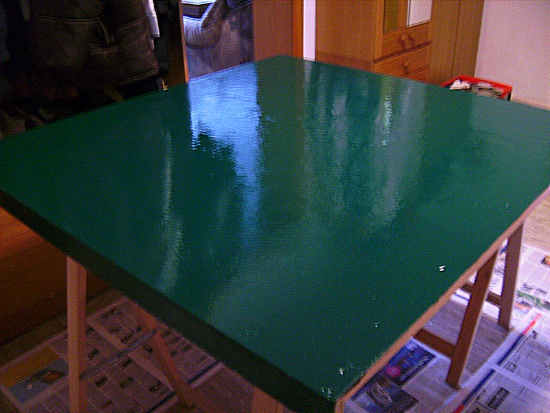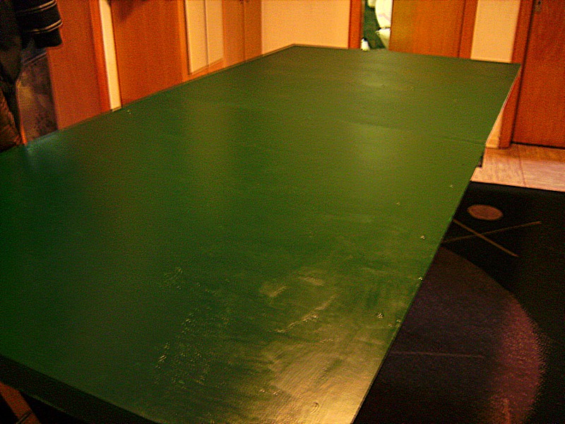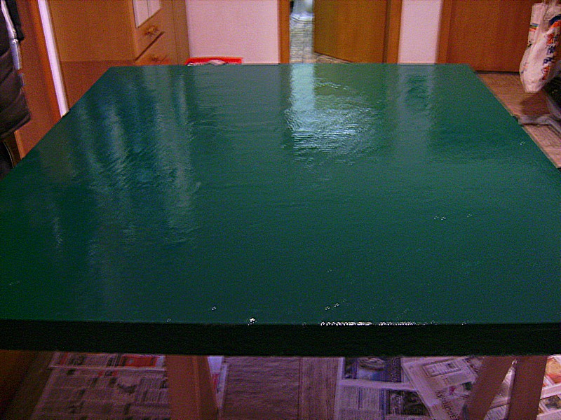 Nach dem ich mir heute Morgen die Grundierung der 2. Platte angesehen und ebenfalls für gut befunden habe, wurde lackiert. Leider reichte der Lack nicht mehr für alle Kanten. Ich frage mich daher habe ich einfach zu wenig gekauft oder wurde der Lack zu dick aufgetragen ?? Aber das kann man ja auch noch später nach machen. Die Hauptsache ist erst einmal sind beide Platten Moosgrün. Ich hoffe das die heute Abend trocken sein wird, so das der Aufbau der Anlage noch begonnen werden kann. Sonst geht es eben erst Morgen weiter.