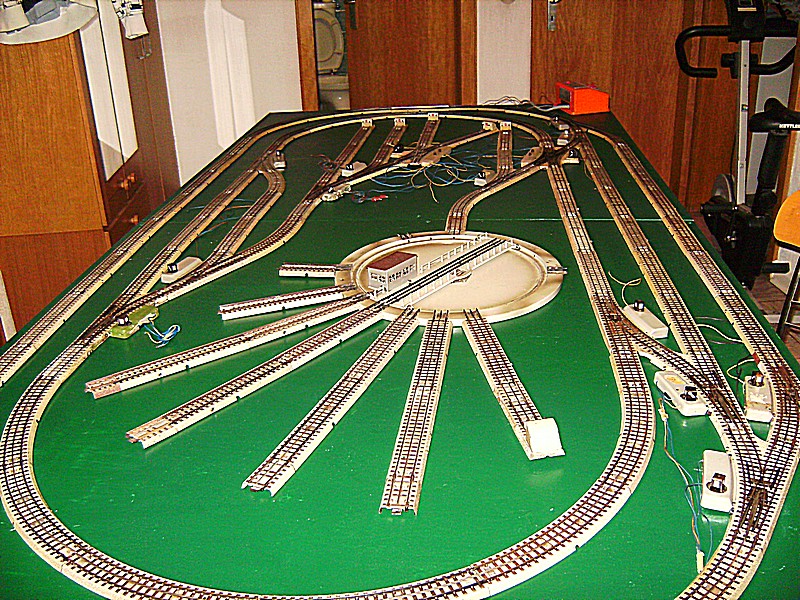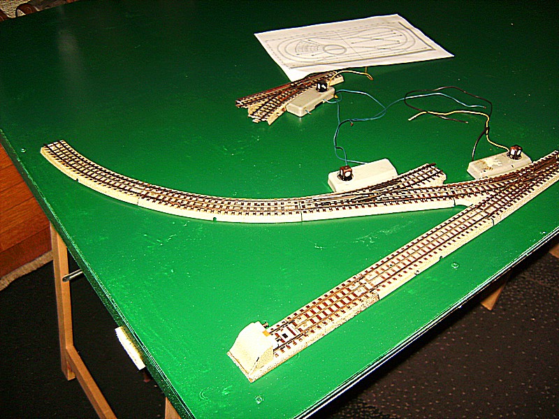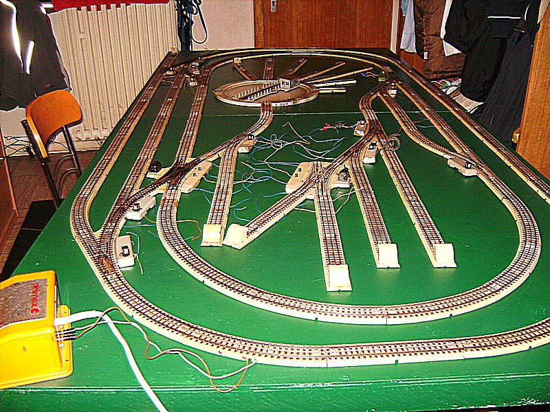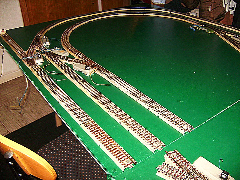 Nachdem nun die Platte trocken ist, habe ich beide auf mein Bock/Lattengerüst gestellt und habe erneut die Anlage aufgebaut. Nach dem Aufbau kam die Probefahrt, zum Glück, denn es gab einen Kurzen. Wo kam der also her ??denn an der Lok konnte es nicht liegen die hatte ich gar nicht drauf. Es ist eine ganz alte Angewohnheit von mir, bevor eine Lok auf das alte M - Gleis kommt erst einmal den Regler auf zu drehen um zu sehen ob es einen Kurzen gibt oder nicht. . Doch die Sucherei macht keinen Spaß, weil ich von dem Anschlußgleis aus jedes einzelne Gleis überprüft werden muß. Ich war fast hanz rum als ich den Fehler gefunden  hatte. Eine Verbindungslasche des Mittelleiters war verbogen, also gerichtet und siehe da es ging.