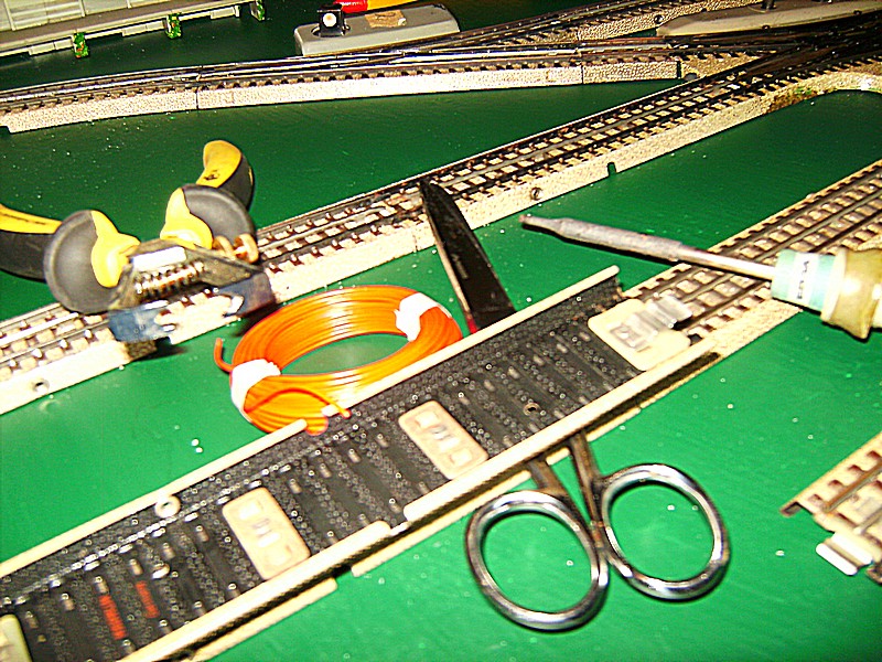 Die Methode Papenberg funktioniert auf jeden Fall, was Testfahrten bewiesen haben. Im Keller hatte ich noch 2 Stellpulte mit Kippschaltern die ich für das Ein - und Abschalten des Stromes eingesetzt habe. Die drei vorderen Streckengleise sind nun zwischen den Weichen einzeln abschaltbar. Das war notwendig, da ich ja wegen des Transports keine Signale anbringen kann, oder nur mit sehr viel Aufwand.