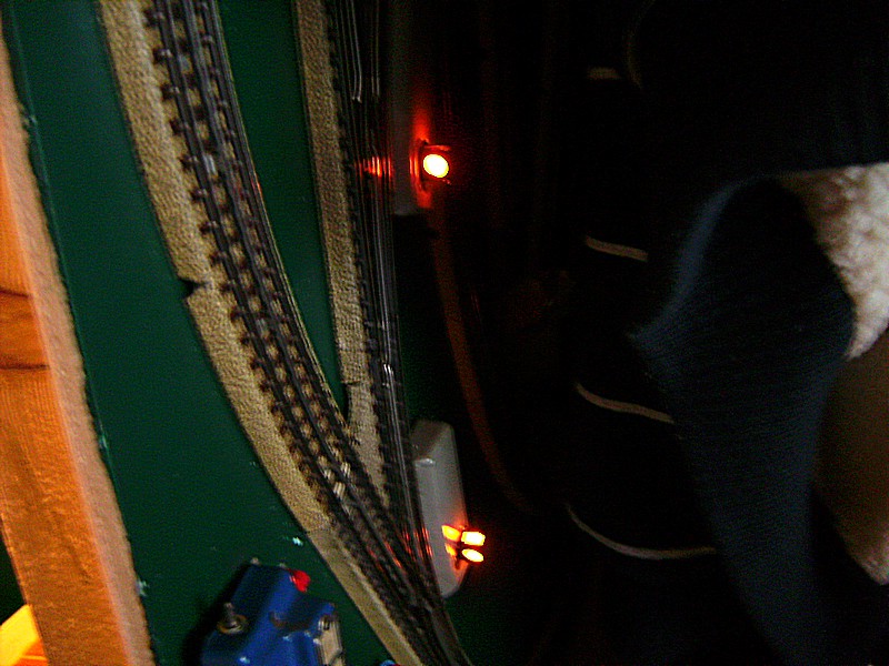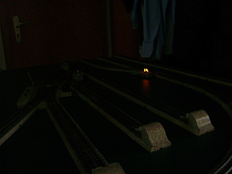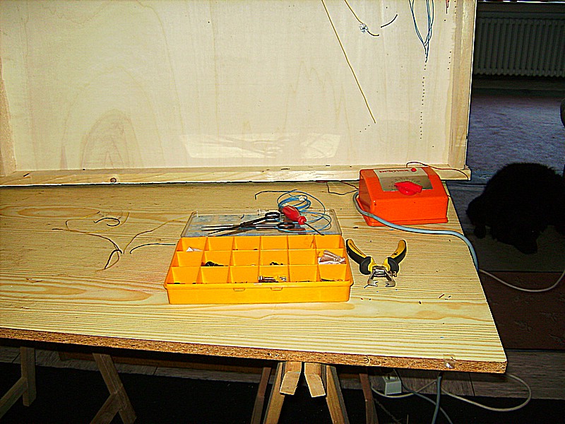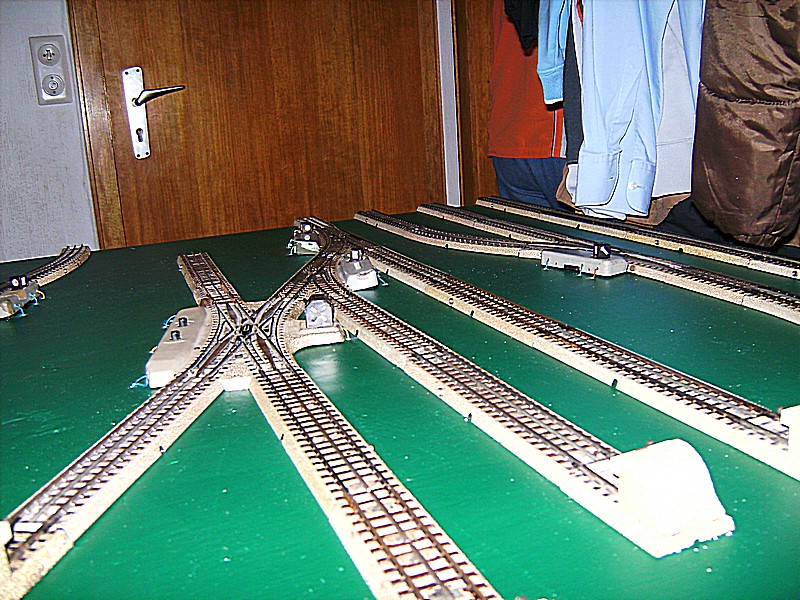 Heute habe ich 6 Weichen und 2 DKW?s angeschlossen. Damit ich besser arbeiten konnte, habe ich in meiner Diele vor der Garderobe 2 Böcke aufgestellt und darauf eine ca. 1,20 x 0,65 m große Spanplatte gelegt. Der rechte Teil der Anlage wurde dann hochkant mit der Unterseite nach vorne, gegen die Garderobe gelehnt. Die Stellpulte wurden nur provisorisch mit dem Trafo verbunden, damit ich sofort probieren konnte ob die Weichen auch gingen.