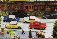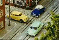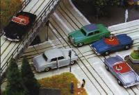 Alle auf diesem Foto zu sehenden Fahrzeuge sind fahrbar. Die Technik an sich ist einfach, es wird in die Modellstraße ein Spezialdraht verlegt. Die Radien sollten so bemessen werden, dass das größte Fahrzeug problemlos die Kurve durchfahren kann. Danach wird der Draht eingespachtelt und mit einer - auch von Faller erhältlichen - Straßenfarbe gestrichen. Dadurch ist der Draht unsichtbar, aber für den Führungsstift der Autos "fühlbar". Auf diesem Draht fahren die Autos je nach Akkugröße bis zu fünf Stunden. Durch Elektromagnete können die Autos beeinflusst werden, so dass man damit z.B. eine Bushaltestelle oder einen Ampelstop einrichten kann. Eine ausführliche Bauanleitung findet man in dieser neuen Broschüre:
