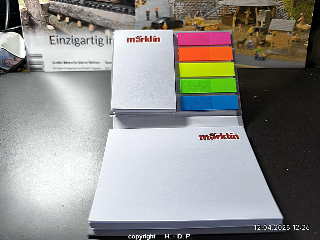 Vor der Halle war es schon sehr voll und als sich die Türen um 8:45 Uhr öffneten strömte alles in die Vorhalle und es bildeten sich nebeneinander 5 lange Schlangen und in einer davon standen auch Jutta und ich. Plötzlich kam einer der Mitarbeiter auf mich zu und sagte mir das es für uns einen anderen Durchgang geben würde da ich mit einem Rolli unterwegs sei und das hat uns doch sehr gefreut. Um 8:55 Uhr durften wir als erste in die Halle 4 eintreten und so war ich auch der erste am Märklinstand um mir mein Insidergeschenk abzuholen. Es ist dieser kleine Notizblock.
