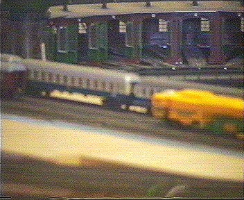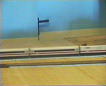 Direkt am Eingang war ein langer Tisch mit Zeitschriften und der Kasse aufgebaut. Danach betrat man einen Schankraum mit Sitzmöglichkeiten und wurde von einem 5 Zoll Krokodil in braun  mit einigen Wagen empfangen. Dann gelangte man in die "heiligen Hallen". Als erstes fiel mir ein Berg ins Auge, der bis unter die Decke reichte, er war sehr schön gestaltet und hatte nichts mit dem "Softeisberg" im Deutschland - Express gemein. Die Anlage selber hatte eine Zungenform mit drei Abschnitten, wovon 2 fertig gestaltet waren.