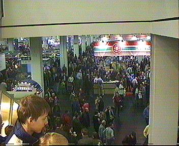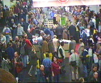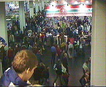 Schon kurz nach der Öffnung war dass Gedränge riesengroß. Am Märklin Stand kam man nur noch mit dem Einsatz der Ellenbogen an die Informationsschalter heran. Ich selber hatte noch keinen neuen Katalog und mein Bekannter wollte sich sein Insider Geschenk abholen. Von den Anlagen haben wir leider nichts gesehen. Ähnlich sah es an fast allen anderen Ständen aus, egal ob Roco, Faller, Vollmer oder Tillig. Überall dass gleiche Gedränge, so dass meine Videokamera fast nichts zu tun bekam.