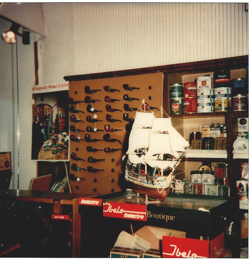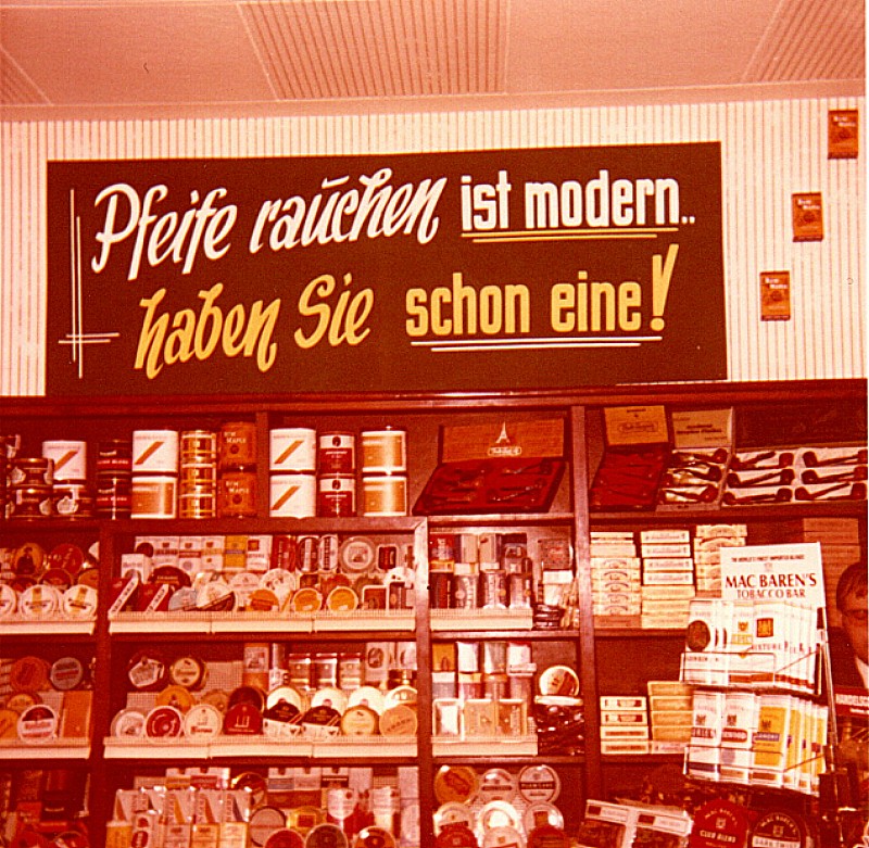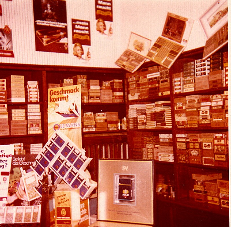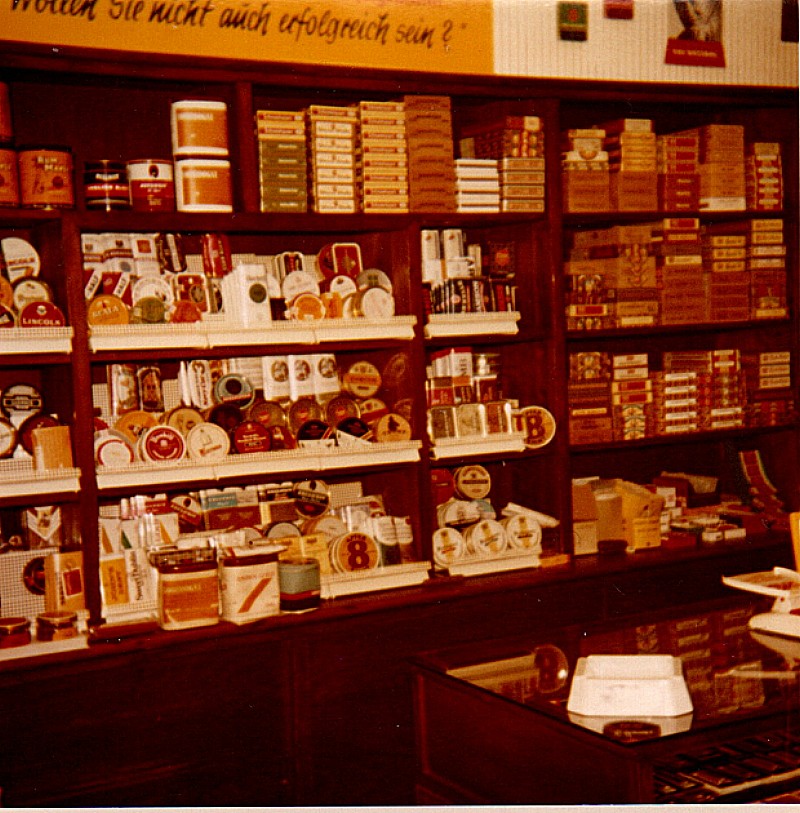 Nun möchte ich Euch einige Bilder von meinem Laden zeigen, denn ich machte etwas was es damals nur ganz selten gab, nämlich ein Proberauchen von Pfeifentabak und Zigarren, und das nannte ich Tabak-, bzw. Zigarrenbar. Die Industrie stellte mir das benötigte Material gerne kostenlos zur Verfügung und auch mein Schaufenster war dann immer auf die entsprechende Aktion dekoriert.