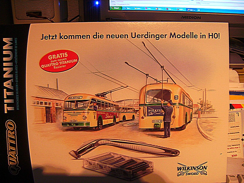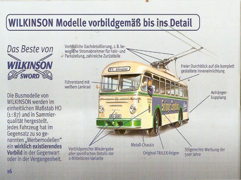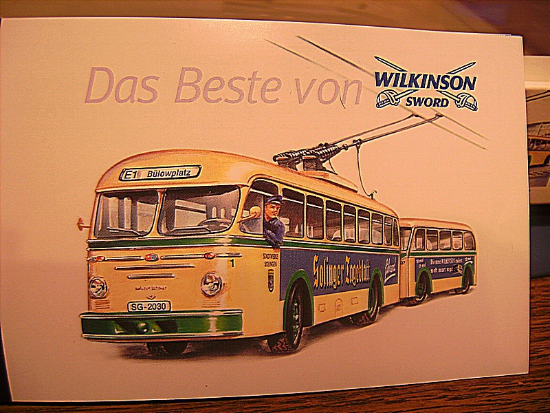 Über dem rechten unteren Bus kann man noch erkennen, das da eine Hülle ist. In dieser Hülle steckte noch ein kleines Begleitheftchen mit interessanten Dingen rund um diesen alten O-Bus. Die ersten sieben Seiten sind natürlich Werbung für Wilkinson, aber da kann man getrost drüber hinwegsehen.