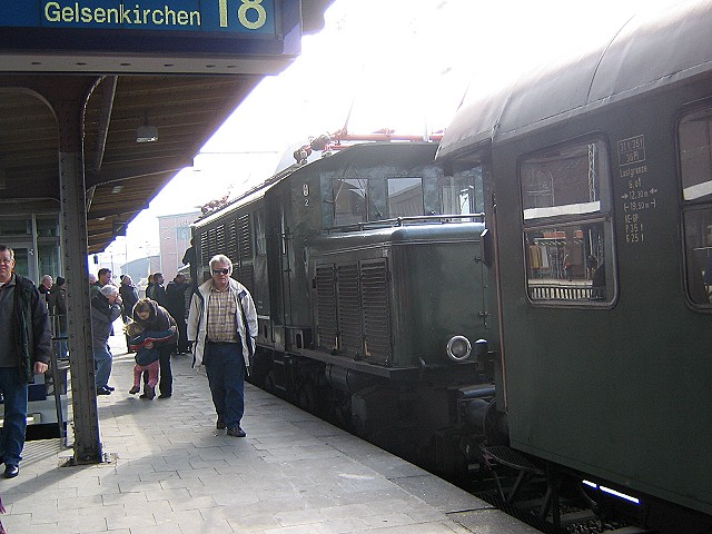 Es ging schon bei der Anreise zum Bahnhof los. Ich wollte in Duisburg Hbf zusteigen und meine Frau fuhr mich zum Bahnhof. Eine Fahrt, die unter normalen Bedingungen gerade einmal 10 Minuten dauert wurde aber zu einem Geduldsspiel. Die BAB A 40 war bereits an unserer Anschlußstelle Moers Ost dicht. Die Autos standen soweit man nur sehen konnte. Also nicht auf die BAB sondern Landstraße über Rheinhausen fahren. Nur war es hier auch nicht sehr viel besser, da viele Leute die gleiche Idee hatten. Doch lange Rede kurzer Sinn ich habe es mit hängender Zunge noch so eben geschafft. Als ich die Treppe zum Bahnsteig hochging, fuhr der Sonderzug gerade ein, aber für ein Foto mußte die Zeit noch reichen,also noch mal die Beine in die Hand nehmen und rein in den Zug und erst einmal ruhig Luftholen. Die Reise ging ja schon gut los.