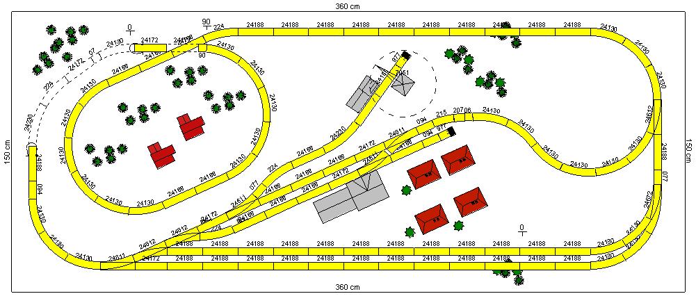 Unser Gleisplan wurde mit WINTRACK der Firma Modellplan für das Märklin C - Gleis gezeichnet. Wir haben aus Kostengründen auf einen Schattenbahnhof verzichtet und dafür 2 lange Gleise im vorderen Bereich geplant. Der Plan ist bewußt recht einfach gehalten, da es für die Kinder dass 1. Mal ist , dass sie sich mit der Modellbahn beschäftigen. Auch die im Plan gezeichneten Häuser sind nicht verbindlich und fehlen uns noch komplett. Als Bahnhof habe ich über ebay das Kibri Modell Kottenforst ersteigert.