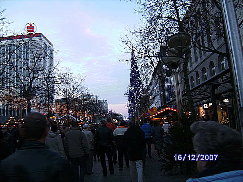 Der Duisburger Weihnachtsmarkt entpuppt sich leider immer mehr zur Freß - und Saufmeile. Vom Kuhtor bis fast zum Bahnhof erstrecken sich die Verkaufsbuden. Wenn man aber glaubt das es sehr viel weihnachtliches zu sehen gibt, den muß ich enttäuschen. In diesem Jahr wurden die Freß - und Saufbuden in Gruppen zusammen gefasst, was heißen soll das es immer mehrere dieser Buden auf beiden Seiten der Königstraße zu finden sind. Dazwischen gibt es dann Flohmarkt Artikel und auch hin und wieder etwas weihnachtliches, was aber eindeutig in der Minderzahl ist. Sehenswert ist wohl ein beleuchteter Baum vor dem neuen City Palais. Alleine für diesen Baum lohnt sich eine Fahrt nach Duisburg.