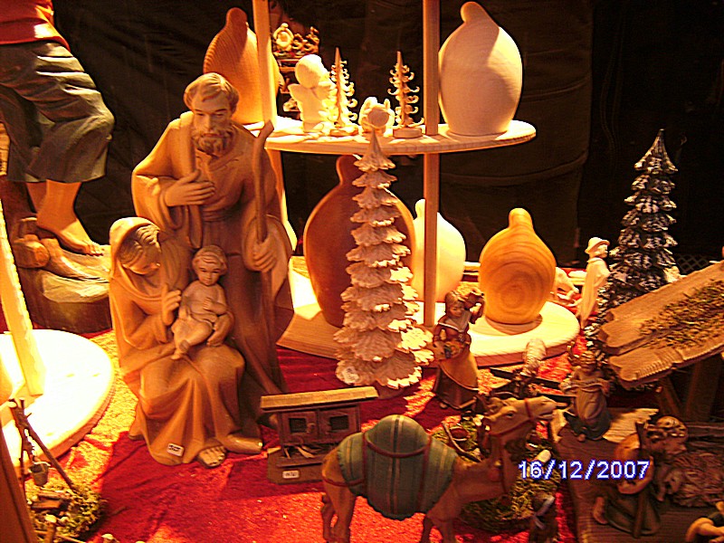 Am Sonntag Nachmittag herrschte schon ein reger Betrieb, der aber im Vergleich zum Nürnberger Christkindlesmarkt sehr gering, aber für Duisburg doch recht ordentlich war. Allerdings wurde fast nur gegessen und getrunken, denn diese Buden waren dicht umlagert. Der einzige Weihnachtsstand der sehr gut besucht war, war die begehbare Hütte von Käthe Wohlfahrt. Hier schlägt das Herz eines Weihnachst Nostalgikers Purzelbäume vor Begeisterung, wenn auch die angebotenen Artikel nicht gerade als preiswert anzusehen sind.. Eine weitere Hütte war ebenfalls sehr sehenswert da dort ein Krippenschnitzer seine Kunstwerke ausgestellt hatte und diese auch verkaufte. Es gab dort Krippenfiguren in allen Ausführungen, von traditionell bis super modern. Nur einen Stand der richtige Weihnachtskugeln verkaufte habe ich leider nicht gefunden. Es gab zwar auch Kugeln dort, aber das waren alles Sachen die nicht meinem Geschmack entsprachen.