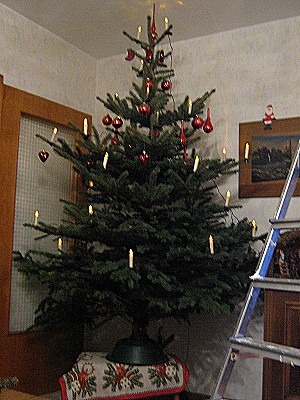 Wie jedes Jahr auch heute wieder der Aufbau meines Weihnachstbaumes. Doch vor den Bildern eine kleine Anmerkung. In diesem Jahr habe ich mir neue Weihnachtskerzen gekauft. Es sind keine Kerzen mehr wie sie einmal waren, sondern es sind LED Kerzen, die einmal fast wie eine echte Kerze aussehen und zum anderen auch noch leicht flackern. Diese neuen Kerzen haben einen zentralen Anschluß, der im Baum versteckt wird. Jede Kerze kann auch alleine brennen, nicht wie früher wenn eine mal kaputt war brannten alle nicht mehr. Jede Kerze hat ein 1,30 Meter langes Kabel und wird an die Zentrle angeschlossen. Das ganze wird sehr bequem über einen Fußschalter angestellt. Außerdem gibt es wunderschöne Lichteffekte an der Decke.