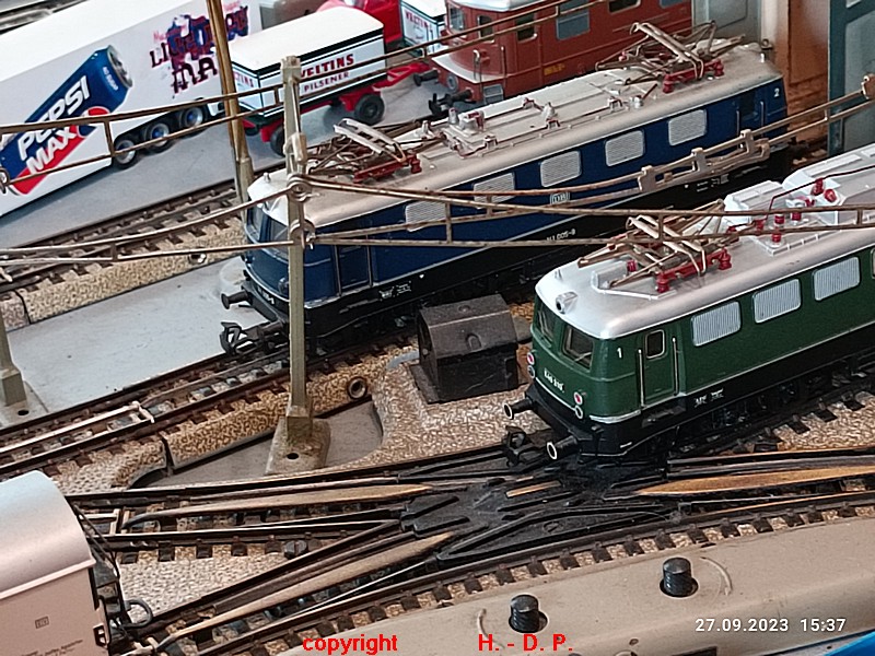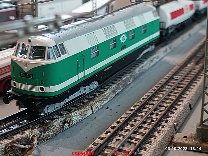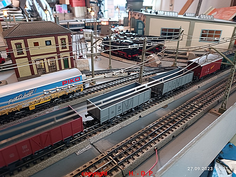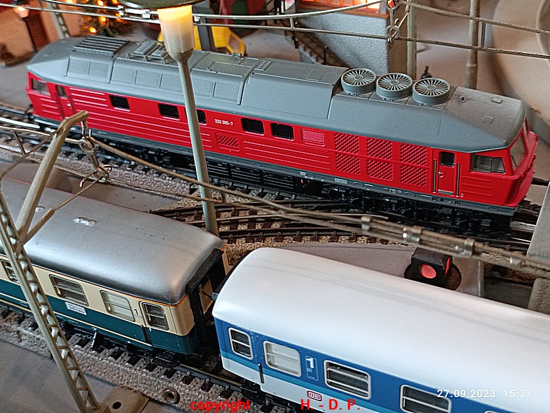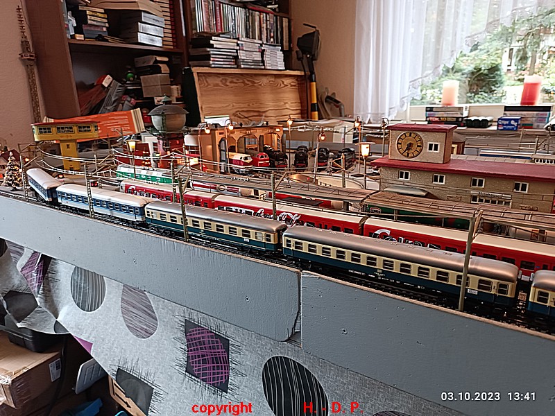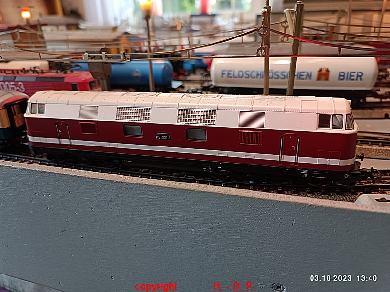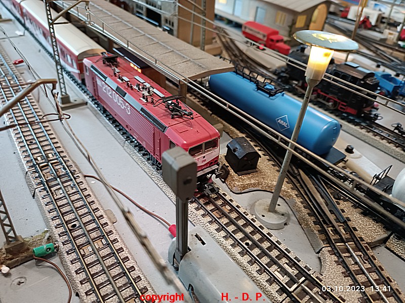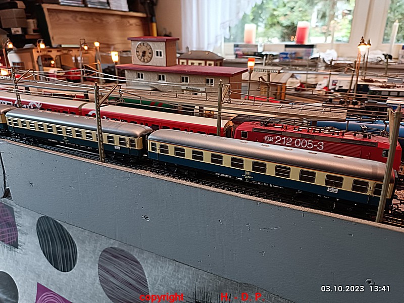 Die Spieltage über die ich heute berichten möchte standen unter dem Motto " Ex DDR und Russen Power " und es fuhren auch nur die Loks die dem Motto entsprachen. Die Loks stammten von den Firmen Märklin und Piko und die Wagen waren von den Firmen Hag und Märklin. In Ermangelung von DR Personen - Schnellzug Wagen Wagen habe ich natürlich Wagen der DB benutzt, denn Personenwagen der R haben mich an sich nie wirklich interessiert, was bei Loks doch anders war.