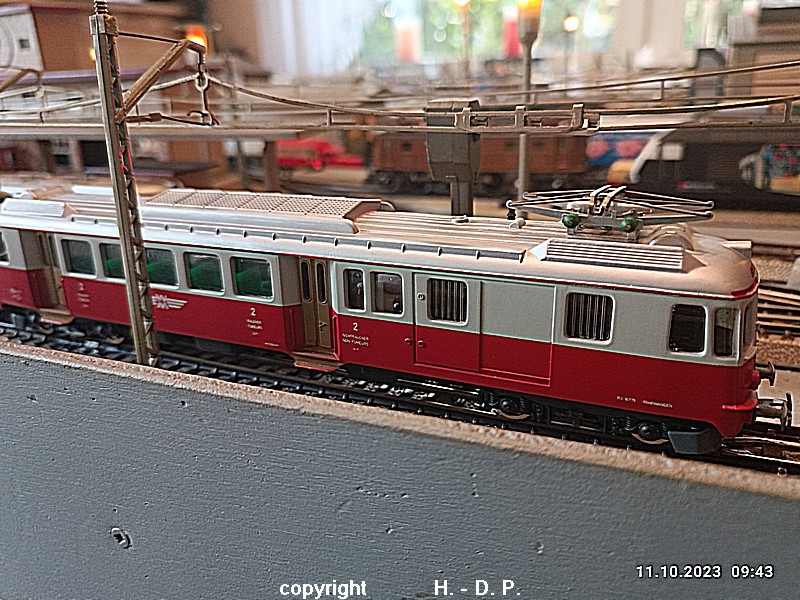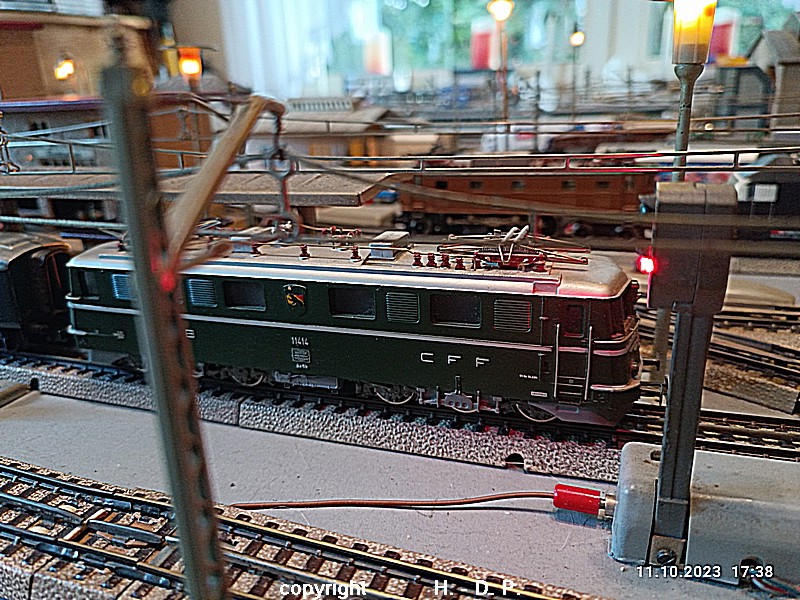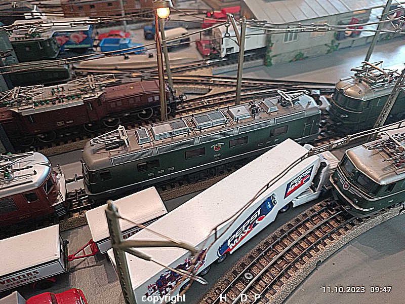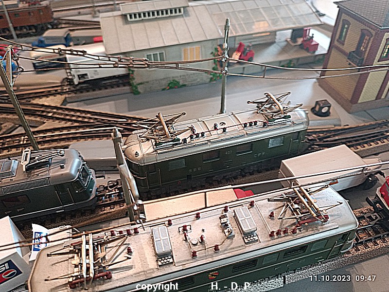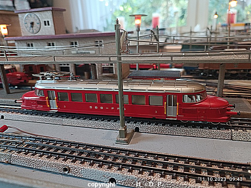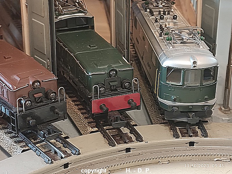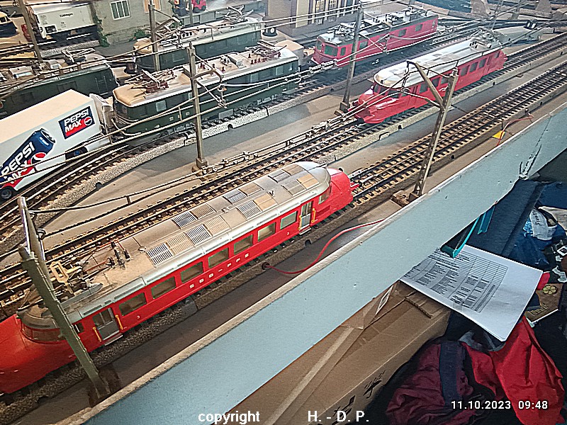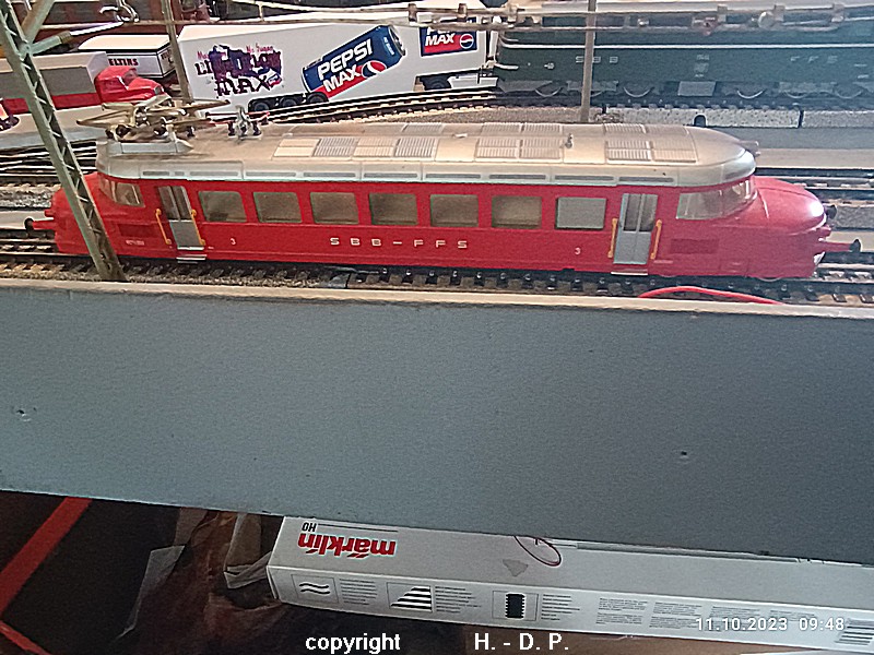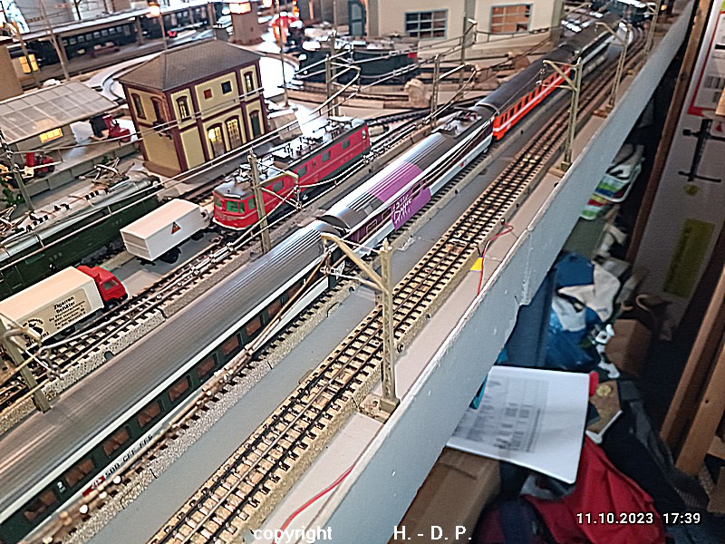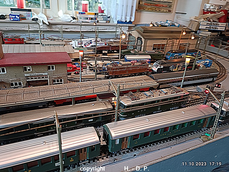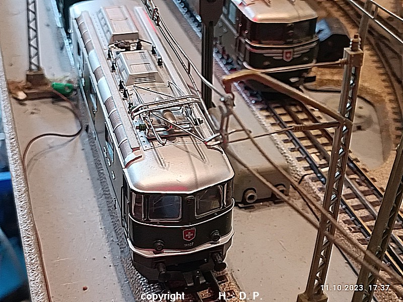 Der heutige Spieltag stand unter dem Motto " mal wieder Schweizer Käse, ach nee Schweizer Tage in Heinhausen " Ich habe fast alle meine Loks nach Schweizer Vorbild aus den Vitrinen zusammengesucht und auf die Platte gestellt und auf der Platte habe ich Platz für insgesamt 20 Loks. Zuerst fuhren Schweizer Triebwagen und zwar 2 x Roter Pfeil und ein Triebwagen mit Steuerwagen. Bei der nächsten Runde kamen Schweizer E - loks zum zuge und daruter die braune Doppellok der BLS.