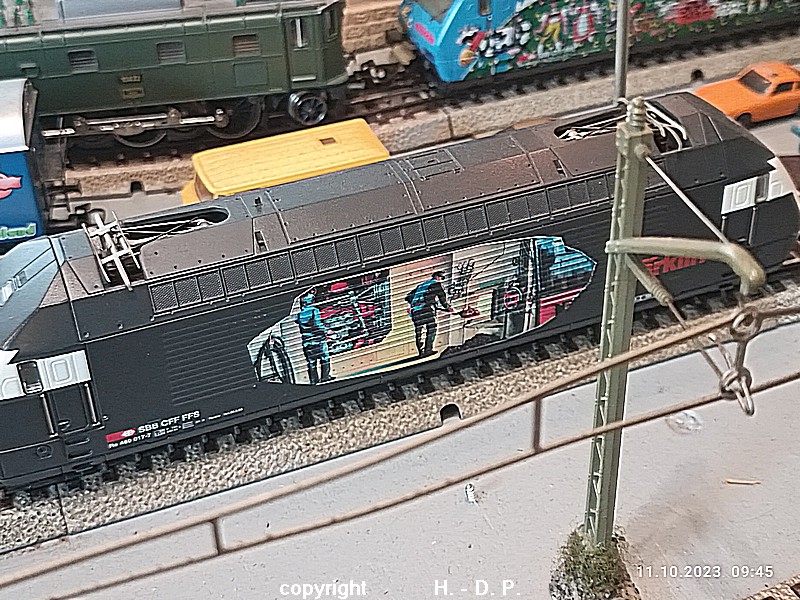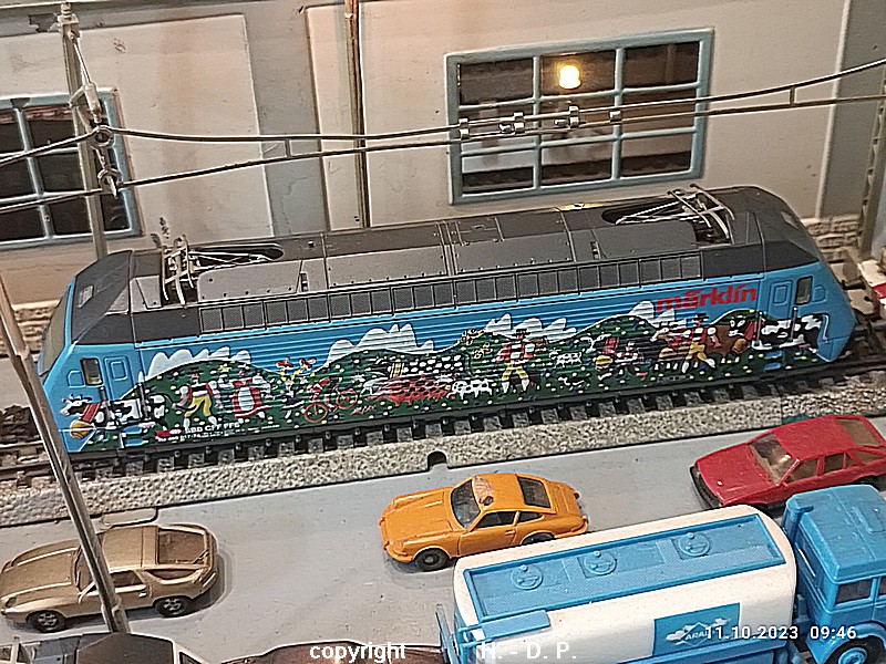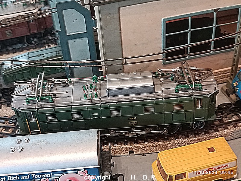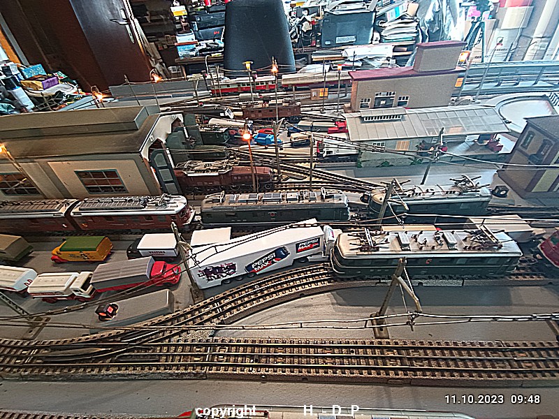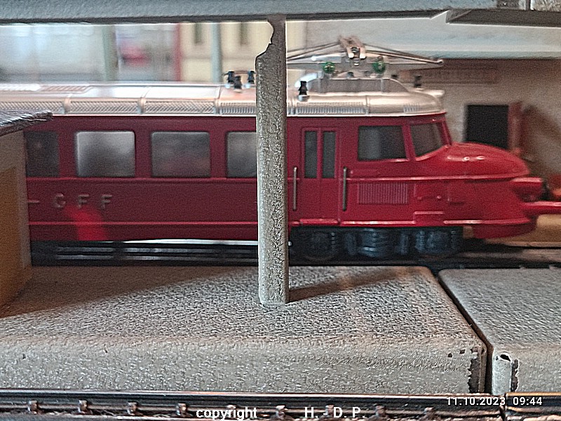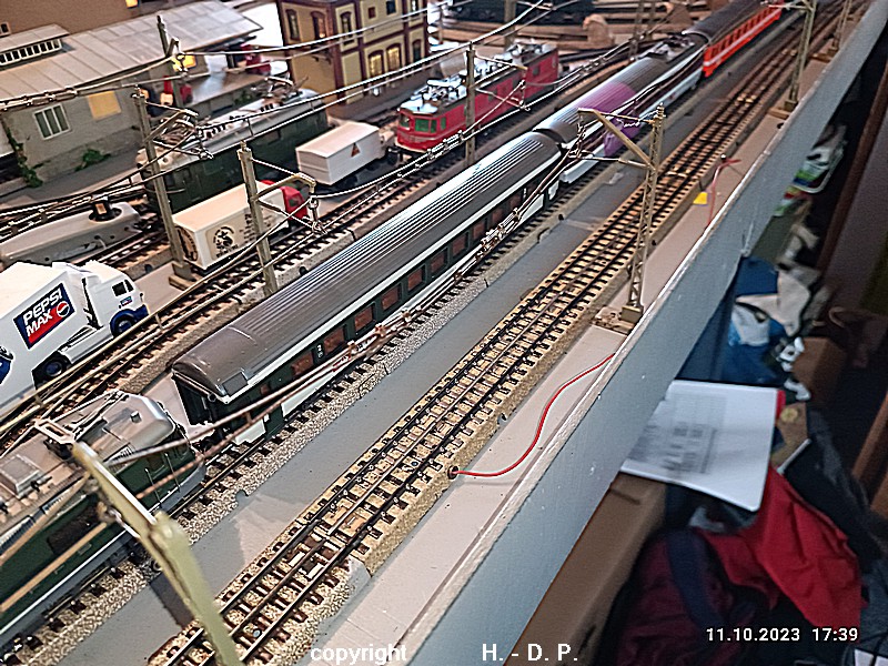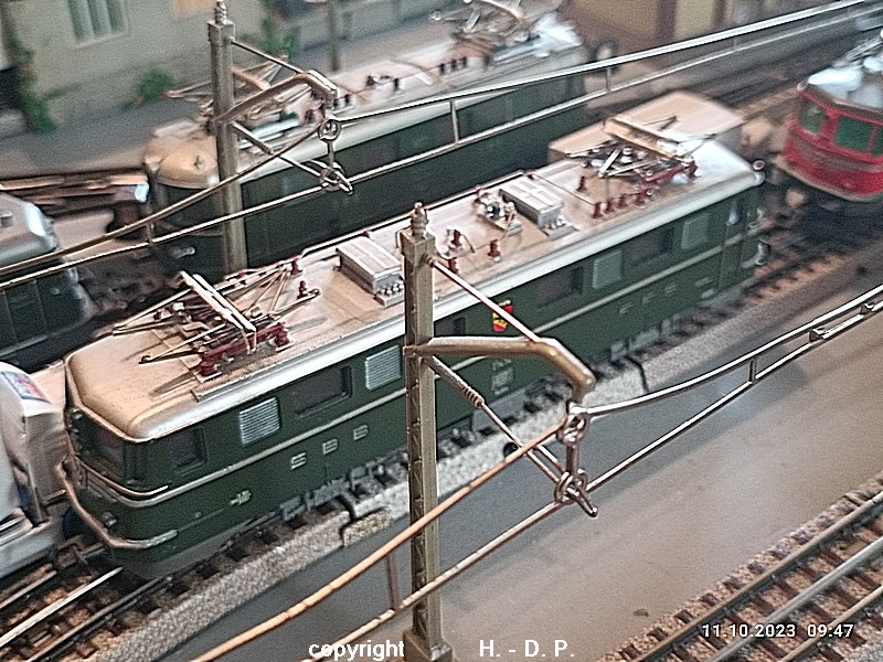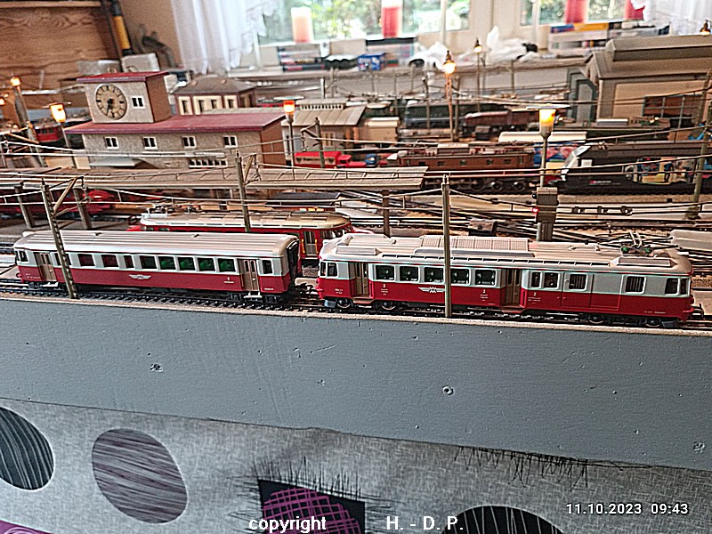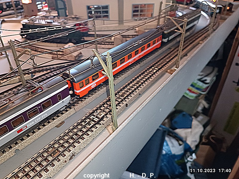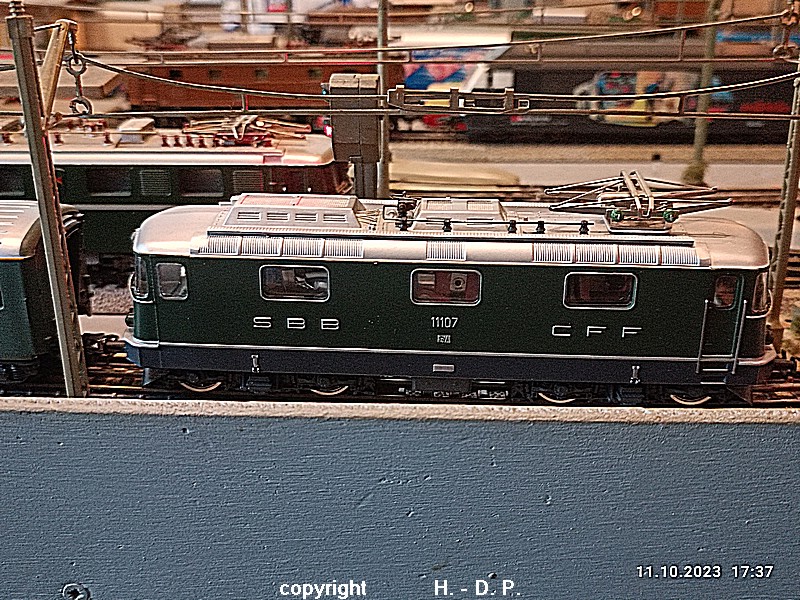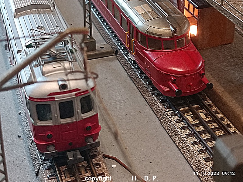 Der heutige Spieltag stand unter dem Motto " mal wieder Schweizer Käse, ach nee Schweizer Tage in Heinhausen " Ich habe fast alle meine Loks nach Schweizer Vorbild aus den Vitrinen zusammengesucht und auf die Platte gestellt und auf der Platte habe ich Platz für insgesamt 20 Loks. Zuerst fuhren Schweizer Triebwagen und zwar 2 x Roter Pfeil und ein Triebwagen mit Steuerwagen. Bei der nächsten Runde kamen Schweizer E - loks zum zuge und daruter die braune Doppellok der BLS.
