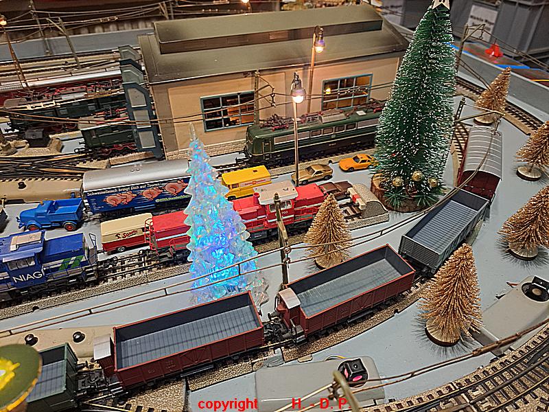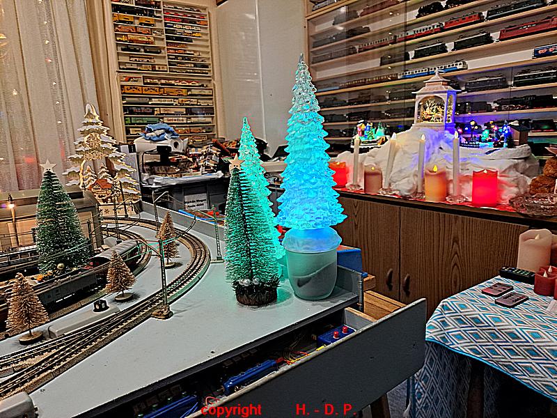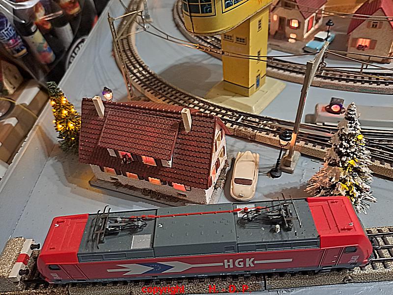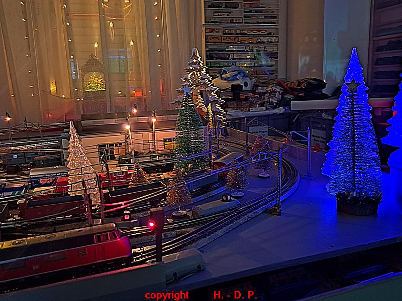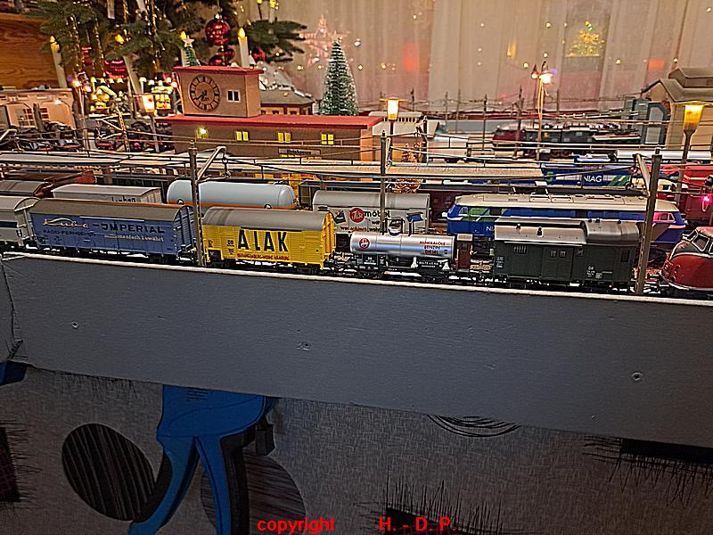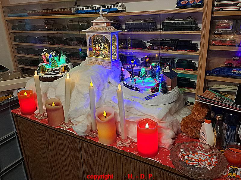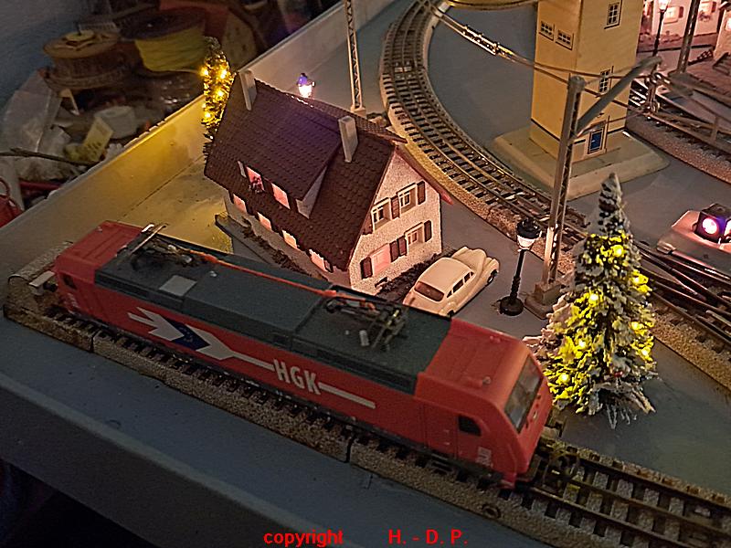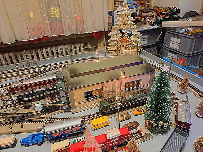 Zu sehen sind meine Märklin Insider Wagen und Gußwagen der Firma Hag. Natürlich wurde die Weihnachtsbeleuchtung nur für die Bilder eingeschaltet und auch die Rollladen wurden runter gelassen, denn erst am Samstag vor dem 1. Advent wird die Beleuchtung im Spielzimmer, Kinderzimmer und Wohnzimmer eingeschaltet, das ist bei uns so Tradition solange ich zurück denken kann.