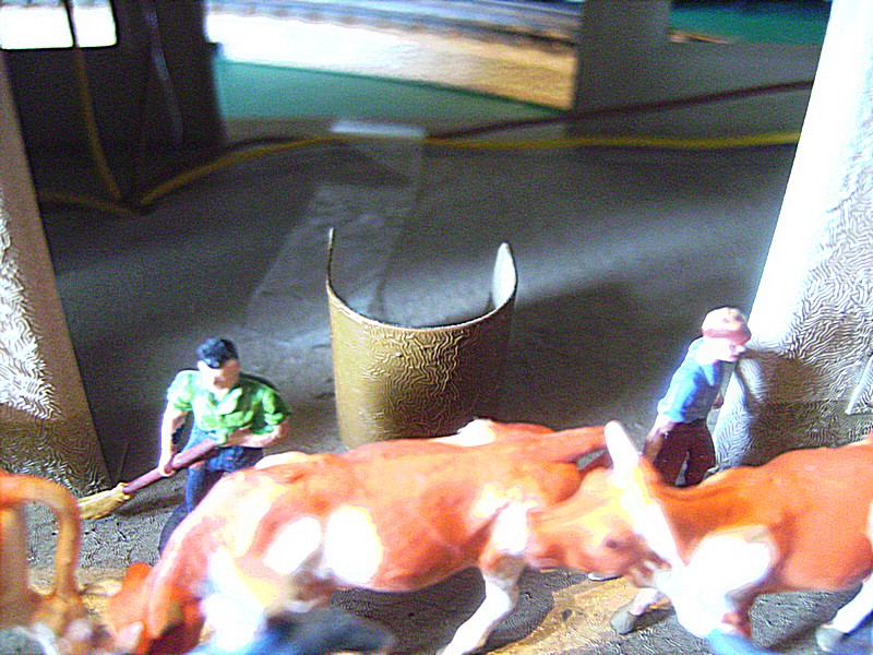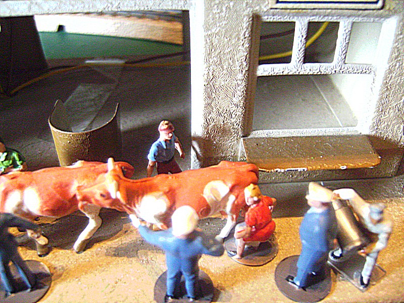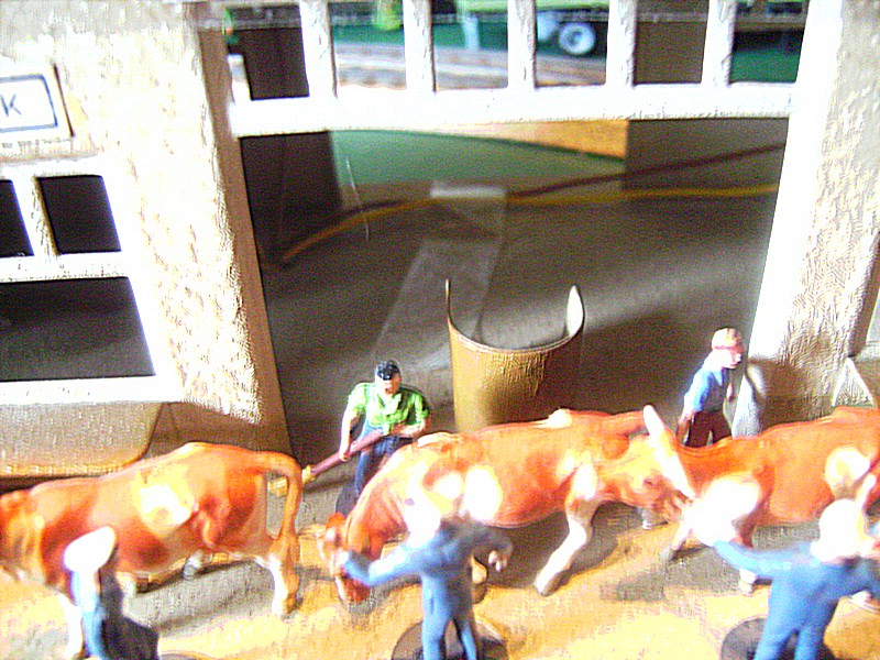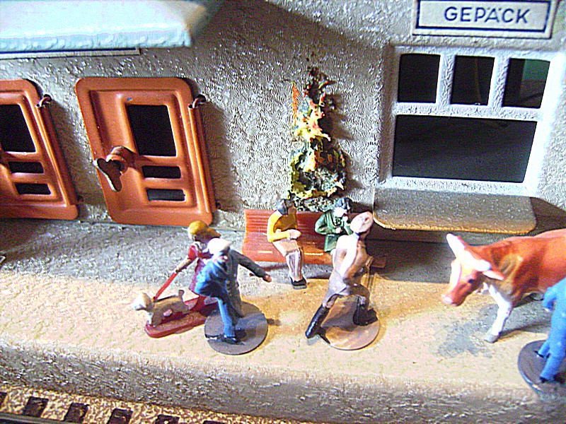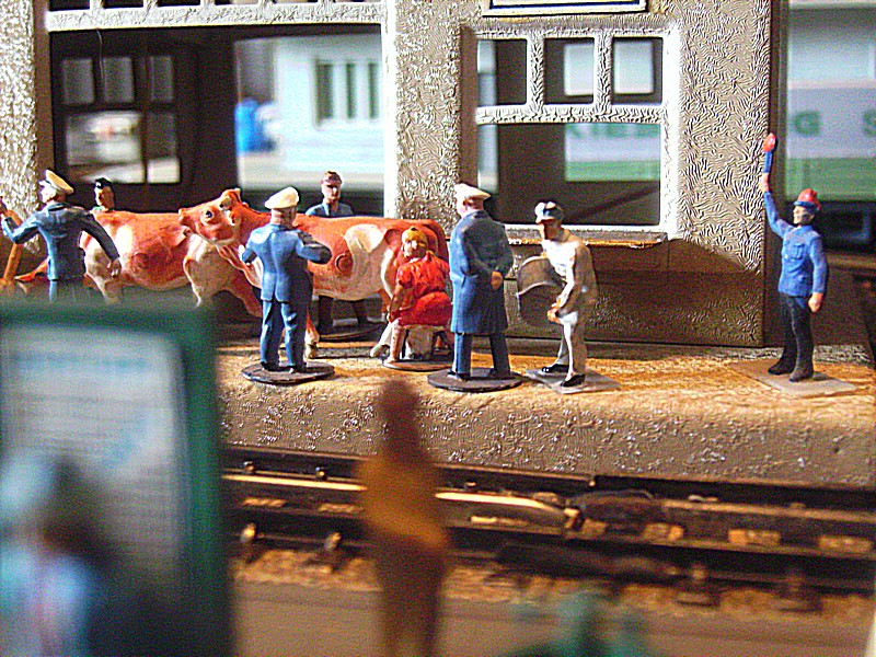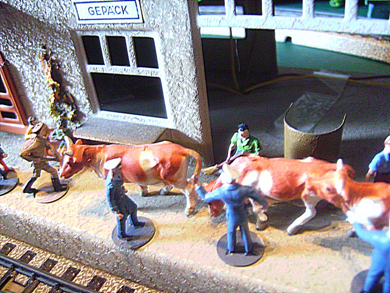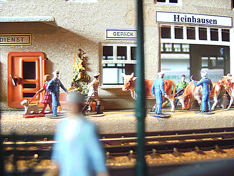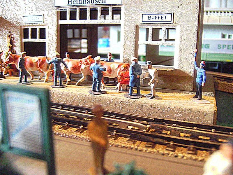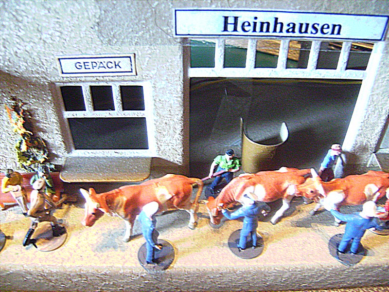 Oma und Opa Lustig saßen auf der Bank und schauten dem lustigen Treiben zu. Herr Peters hatte seinen Sohn Peter auf die Schulter genommen, damit er nicht unter die Hufe kam, während die Stallhelfer Gustav Knute und Freddy Besen die Hinterlassenschaft der Kühe beseitigten, denn man wollte den Bahnhof ja sauber halten. Erich Milchkanne dagegen schleppe eine Kanne nach der anderen ans Gleis und kippe die Milch dort aus.