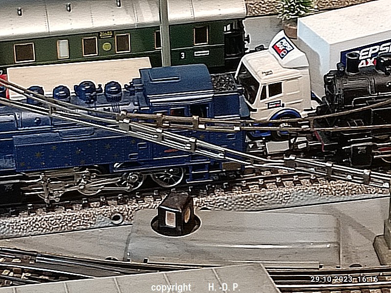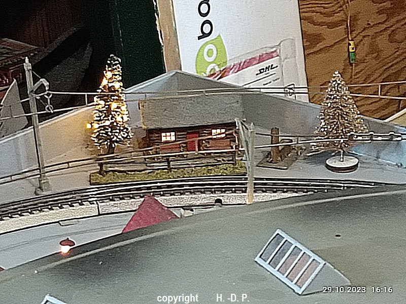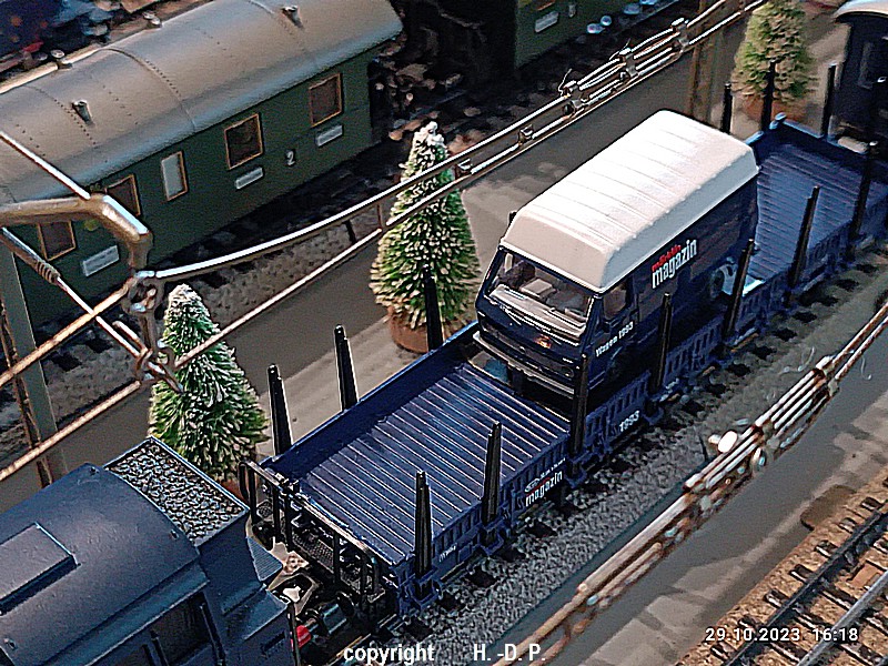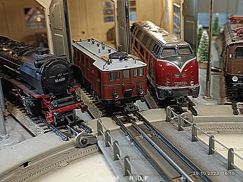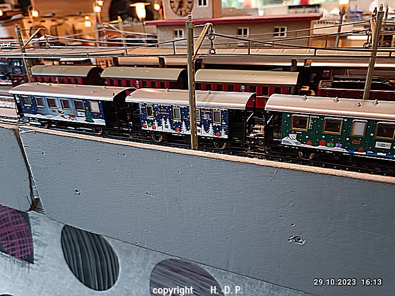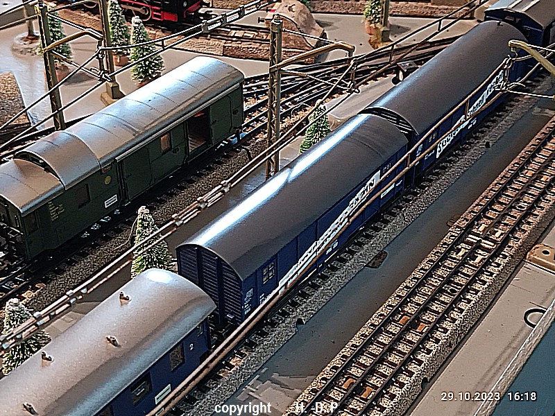 Der heutige Spieltag steht unter dem Motto "Allerlei im vorweihnachtlichen Heinhausen" Dazu habe ich mal einige Loks und Wagen au den Vitrinen, bzw. Stapelboxen genommen, die sonst nur selten bis fast gar nicht auf der Anlage zu sehen sind. Da dieser Spieltag ja schon in der Vorweihnachtszeit spielt, durfte natürlich auch die neue kleine umlackierte 3029, welche ich am letzten Freitag als Platzhalter für die neue Märklin Weihnachtslok von meinen MIST 47 Leuten erhalten habe, nicht fehlen. Ferner kamen noch zum Einsatz meine Märklin Magazin Wagen mit der Märklin Magazin Lok und später alle MM Wagen mit einer BR 50, die kleine Dampflok aus der Packung 0050 allerdings nicht in schwarz sondern in roter englischer Farbgebung als LMS Lok.
