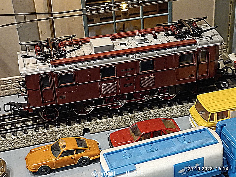 Dazu kam noch der kleine Kittel Dampftriebwagen mit 3 Güterwagen der Fleischindustrie und eine Lok der BR EP 2 der DRG mit neuen Donnerbüchsen aus der 4100 Serie. Alle Loks und Wagen stammen aus dem Haus Märklin. Diese Züge drehten ihre Runden im bereits heute vorweihnachtlich geschmückten Heinhausen.