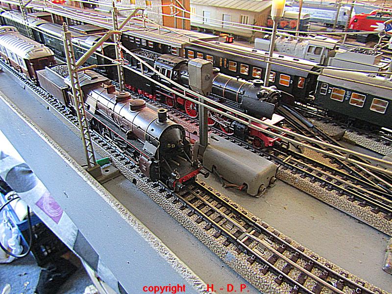 Mein Orientexpress wurde von der S 3/6 der SNBC gezogen und auch diese schöne Belgierin steht fast nur in der Vitrine und die sollte nun auch mal Auslauf erhalten. Weiter waren auf den Gleisen unterwegs eine V 200 mit Umbauwagen, ein Nachkriegs Eilzug mit BR 23, eine Französische E - lok mit Blechwagen der SNCF, ein Eilzug der DRG mit BR 01 HR 800 und ein Bayerischer Zug mit der grünen S 3/6. In den BW`s standen auch nur Loks die sekten zum Einsatz kommen, darunter auch einige moderne E - Loks.