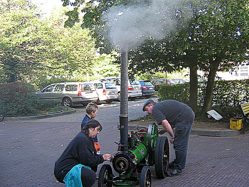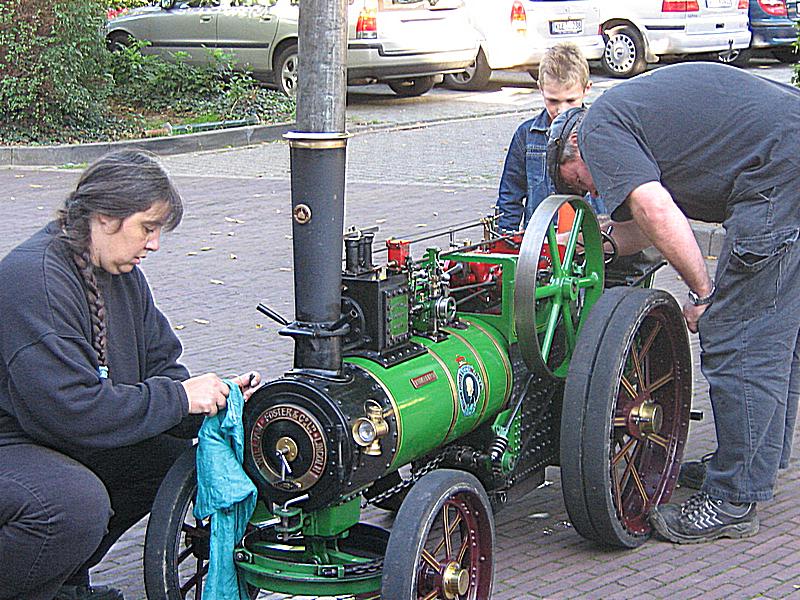 Bereits vor der Halle dampfte es gewaltig, denn ein Mini Locomobil wurde fahrfähig gemacht. Auch eine Dampfeisenbahn war zu sehen. Direkt vor dem Eingang war ein großes Wasserbecken aufgebaut und in einem großen Sandberg wurden LKW`s und Baufahrzeuge gezeigt.