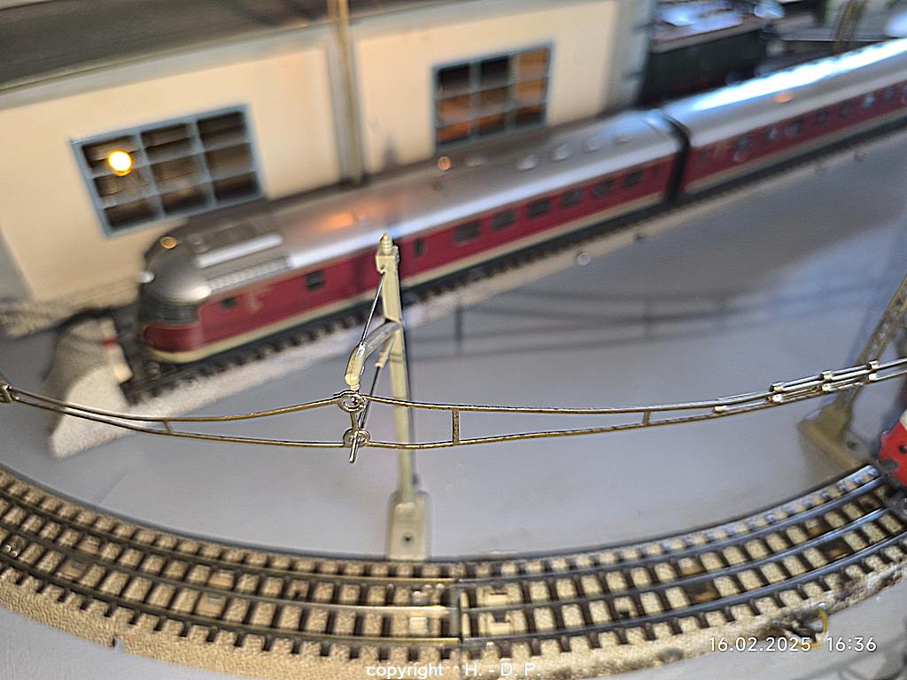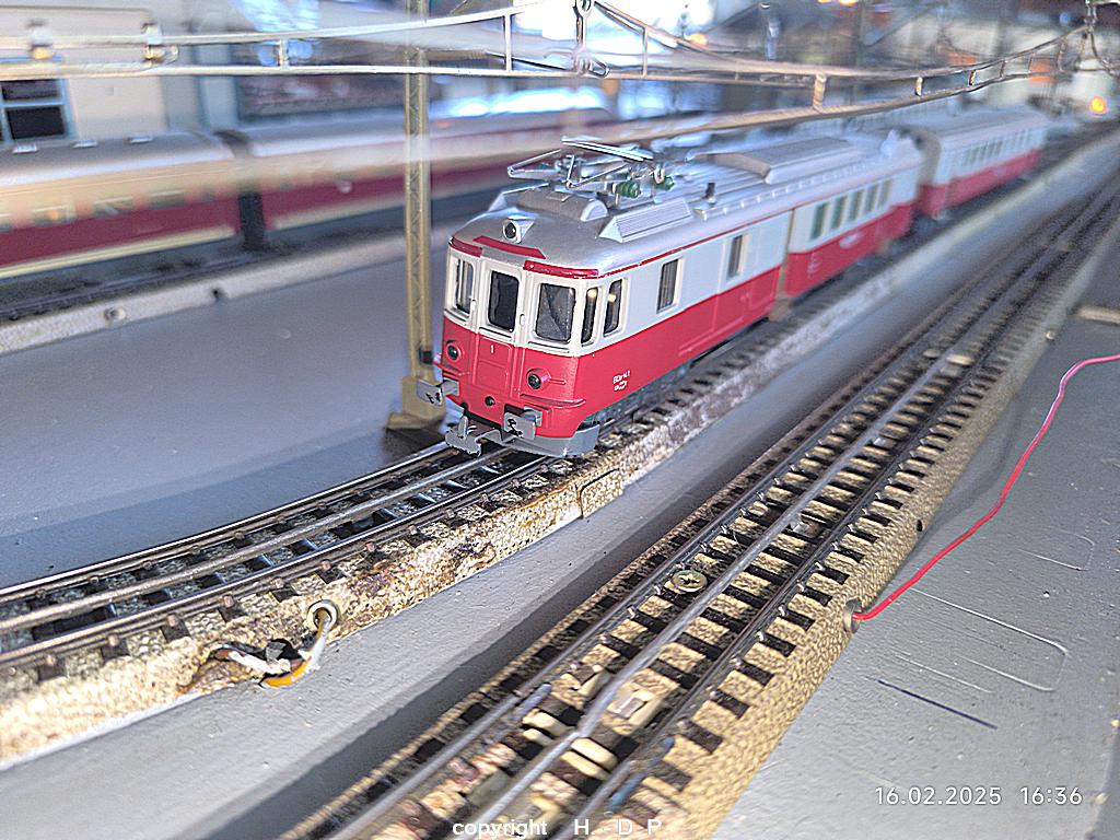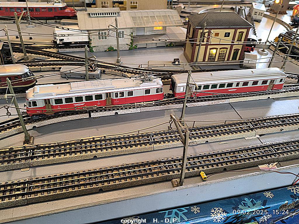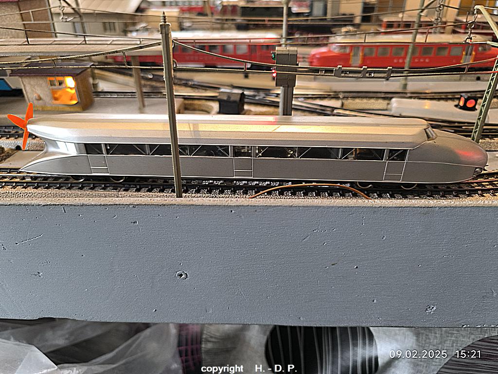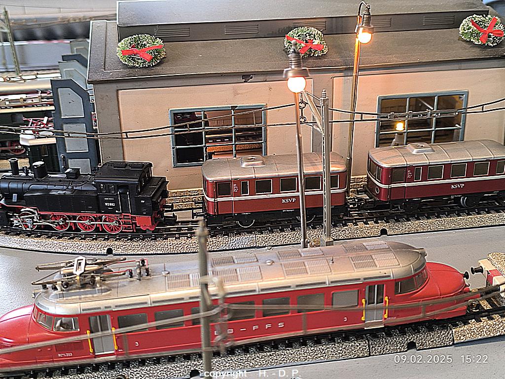 Von der Firma Hag, ein roter Pfeil und ein Trieb - mit Steuerwagen, von Märklin ein roter Pfeil, Ein Schienenzeppelin, ein Posttriebwagen der NS und von Primex die Bayerische Zugspitzbahn. In den Lokschuppen gaben sich 5 Schweizer E - Loks, eine Lok der NS und von der DB 1 x E 44.5 und eine E 32 die Ehre