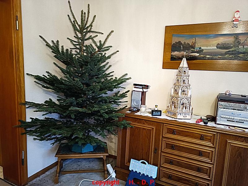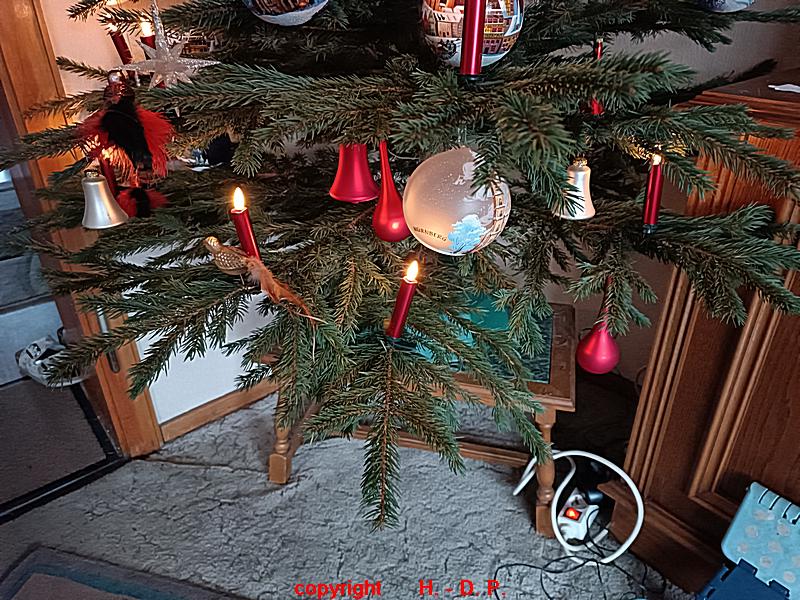 Am Samstag den 17.12.2022 wollte ich an sich den Baum in die Diele holen, in den Ständersetzen und ihn vom Netzt befreien, so das die Zweige sich noch einige Tage aushängen konnten. Leider aber war das für mich unmöglich , weil ich Dussel am Dienstag Abend über die Kante des Teppich in der Diele gestolpert und voll auf das rechte Knie geknallt bin. Zum Glück war nichts gebrochen, aber gewaltig verstacht, so das ich mich mit einem Rollator in der Wohnung bewegen mußte und der Weg vom Wohnzimmer zur Toilette dauerte schon mal ca. 5 Minuten. Frauchen hat dann unseren Sohn angerufen und ihn gebeten den Baum in den Ständer zu stellen, was er auch sofort gemacht hat. Dabei stellte es sich raus das der Stamm nicht so einfach in den Ständer zu bekommen war weil der unten so gebogen war wie das Knie von einem Ofenrohr, was wir beim Kauf allerdings nicht bemerkt hatten. Mein Sohn mußte noch ca. gute 10 cm den Stamm kürzen und er kürzte auch noch die Spitze, so das unser Baum in diesem Jahr für mich eher ein Bäumchen als ein Baum ist, denn die Größe schrumpfte auf ca. 1,80 m.