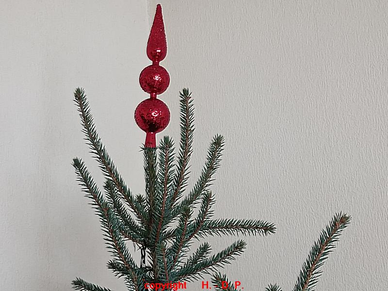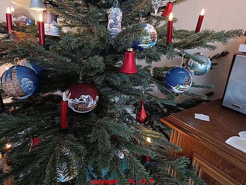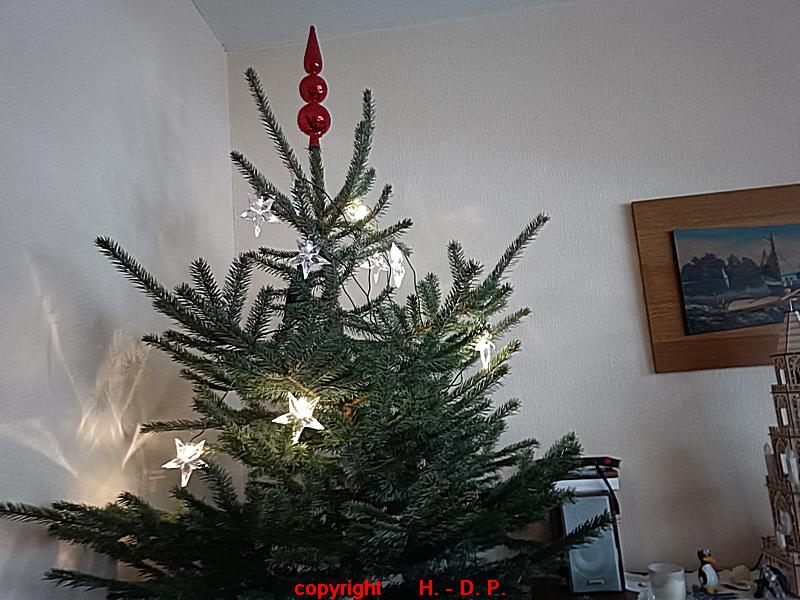 Wie man sehen kann passt der Baum hervorragend zwischen Wand und Sideboard. In den letzten Jahren mnßte der immer richtigrein gequetscht werden, allerdings passen in diesem Jahr leider keine 60 Kugeln an den Baum. Meinem Bein ging es am Sonntag uns Montag schon wieder etwas besser, so das ich ohne Rollator durch die Wohnung gehen kann und dann hat Frauchen am Dienstag die Kugeln aus dem Keller geholt und ich habe den Baum geschmückt und ich konnte sogar auf eine Leiter steigen, denn ohne Leiter konnte ich die Kugelspitze leider nicht anbringen und auch die Leuchtsterne die oben unter der Spitze hängen, denn normale kerzen kann man da nicht gerade anbringen.