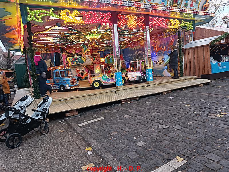 In diesem Jahr fehlte sogar der Eingangsbogen zum Weihnachtsmarkt und dahinter begann noch im Jahr 2019 der Weihnachtsmarkt, in diesem Jahr fehlten auch die Buden und nur ein Kinderkarussell war da wo es immer stand, nur in diesem Jahr einsam  und verlassen. Es fehlt auch ein Bäcker der immer sehr leckere Krapfen verkaufte und der auf dem Markt stand solange ich zurück denken kann. Insgesamt waren viel weniger Buden aufgebaut als noch im Jahr 2019 und  da waren es schon weniger als in den Jahren davor. Auch fehlte  eben fast alles was Weihnachten ausmacht bis auf wenige Buden die etwas anboten das man als weihnachtlich ansehen konnte.
