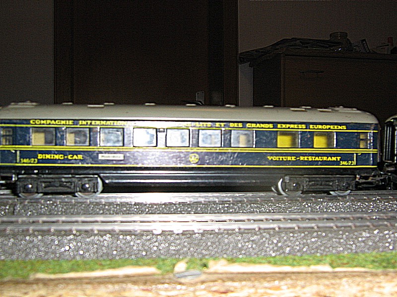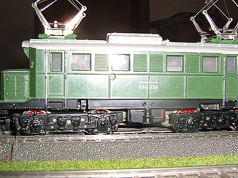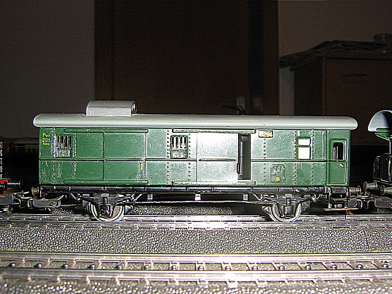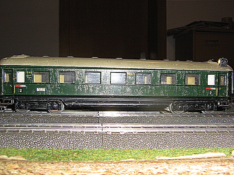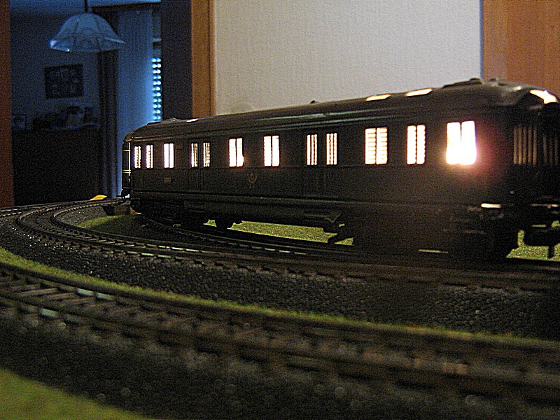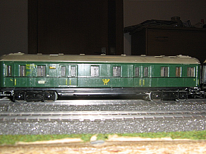 Der zweite Zug war ein Schnellzug aus dem Jahre 1954, Leider nicht mit der Original Lok sondern mit der E 44 Nr. 3011 Bj. 1966 - 1967. Als Wagen kamen zum Einsatz die alten Schürzenwagen der Serie 346 und zwar 1 x 346/1, 1 x 346/3, 1 x 346/3J, 1 x 346/5 und 1 x 346/1. Alle Wagen stammen aus den Jahren 1951 - 1952. Was mich persönlich gewundert und gleichzeitig sehr gefreut hat, ist das der Wagen mit dem Schlußlicht auch nach 54 Jahren immer noch brennt. Auch bei diesem Zug kam wieder das "selige Modellbahnlächeln "auf mein Gesicht. Nach einigen Runden ging zu meiner großen Überraschung noch das Licht in dem Postwagen an.