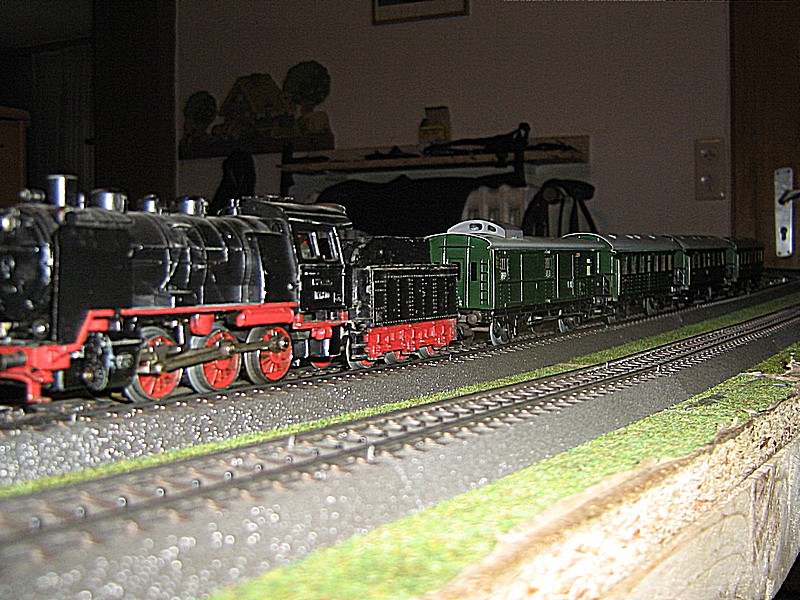 Nach einigen Berichten im Stummi Forum über alte Modelleisenbahnen, habe ich heute einmal versucht Züge mit Material der 50er Jahre zusammen zu stellen. Der erts Zug ist im Märklin Katalog von 1951 auf der Seite 15 zu sehen. Die Lok ist eine RM 800 also der Vorgänger der FM 800 und später 3003.Als Wagen kamen zum Einsatz die Fahrzeuge mit der Artikelnummer 329/1, der späteren Nummer 4002 und ein Gepäckwagen 329/4 später 4003.