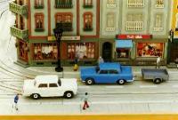 Alle auf diesem Foto zu sehenden Fahrzeuge sind fahrbar. Die Technik an sich ist einfach, es wird in die Modellstraße ein Spezialdraht verlegt. Die Radien sollten so bemessen werden, dass das größte Fahrzeug problemlos die Kurve durchfahren kann. Danach wird der Draht eingespachtelt und mit einer - auch von Faller erhältlichen - Straßenfarbe gestrichen. Dadurch ist der Draht unsichtbar, aber für den Führungsstift der Autos "fühlbar". Auf diesem Draht fahren die Autos je nach Akkugröße bis zu fünf Stunden. Durch Elektromagnete können die Autos beeinflusst werden, so dass man damit z.B. eine Bushaltestelle oder einen Ampelstop einrichten kann. Eine ausführliche Bauanleitung findet man in dieser neuen Broschüre: