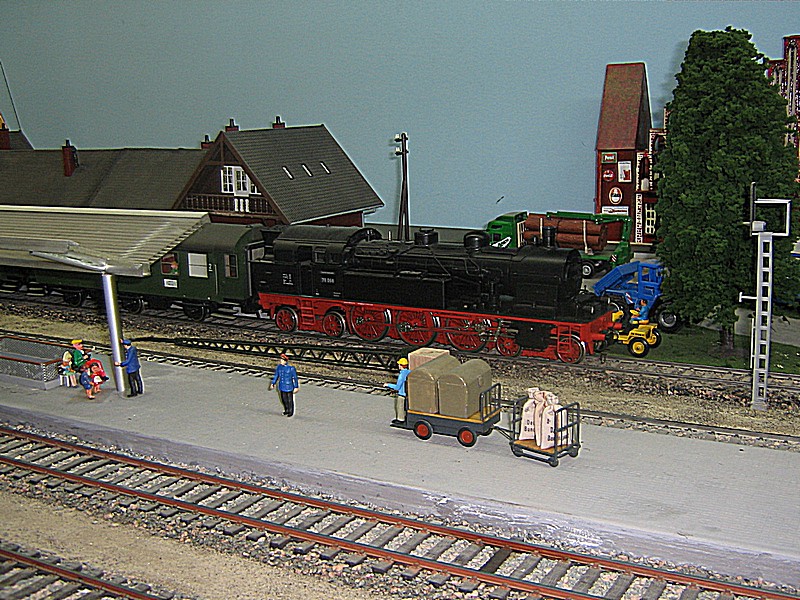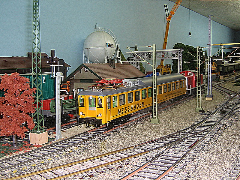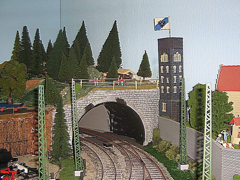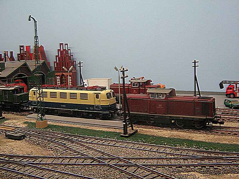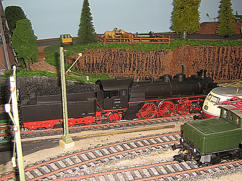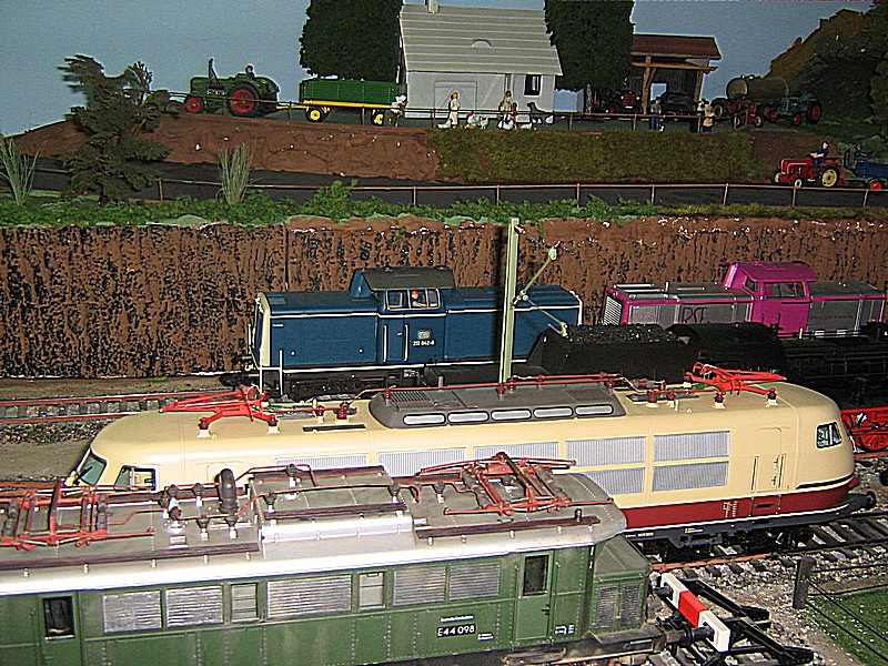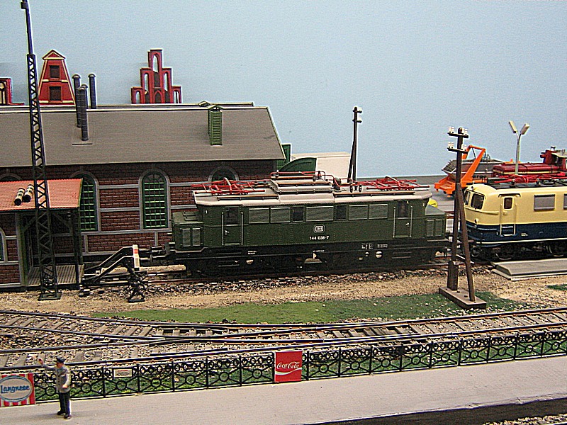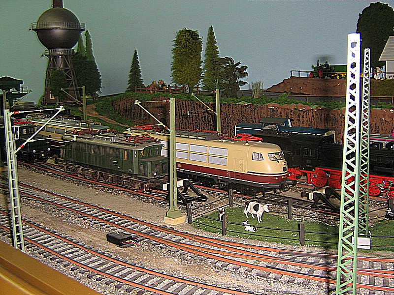 Zu sehen gab es 2 große Anlagen, eine in Spur 1 und eine in Spur HO. Wobei man sagen muß das beide Anlagen noch nicht fertig sind, so fehlt bei der Spur 1 Anlage noch die Oberleitung, nur die Maste stehen bereits. Fangen wir mit der Spur 1 Anlage einmal an.