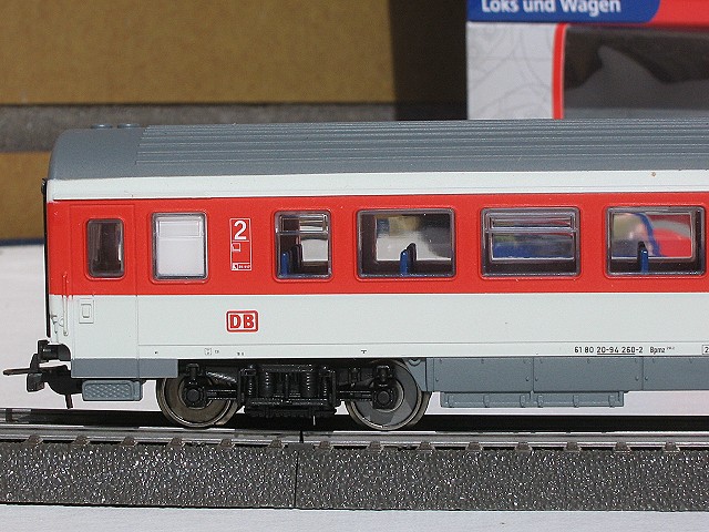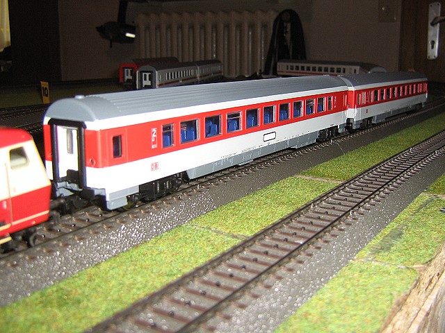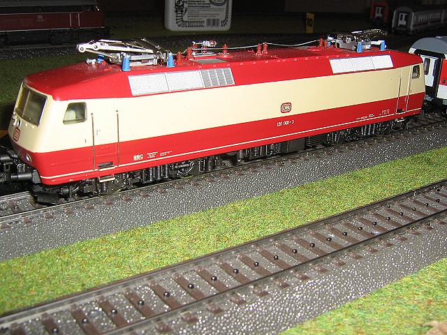 Da ich keine geeignete Zuglok in verkehrsrot habe, außer der BR 1985, mußte meine alte BR 120 in ihrer alten Farbgebung herhalten für diesen Test. Der Zug fuhr in allen Geschwindigkeitsbereichen sehr gut über alle Weichen und ist nicht einmal entgleist. Auf den ersten Blick waren die Wagen alle sehr ordentlich verarbeitet mit einer sehr feinen Beschriftung, doch bei genauerem Hinsehen sind selbst mir, einem der das Vorbild nicht genau kennt, einige Dinge aufgefallen.