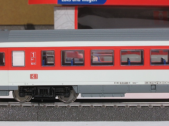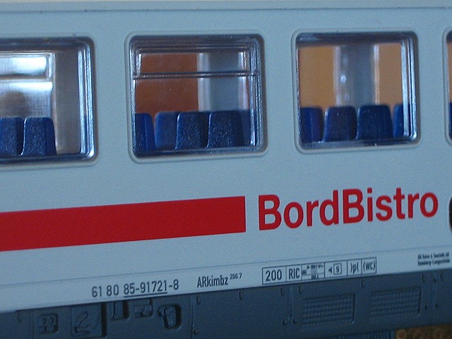 Der 1. Klasse Wagen hat die gleiche Anzahl an Fenstern zwischen den beiden 1. Klasse Zeichen wie der Bord Bistro und der 2. Klasse Wagen und ist auch genau so lang, nämlich 26,4 cm, wogegen der 1. Klasse Wagen von Märklin 27 cm lang ist was wohl bei der Anzahl der Fenster wohl auch richtig ist, nämlich Märklin 14 Fenster und der Piko 11 Fenster