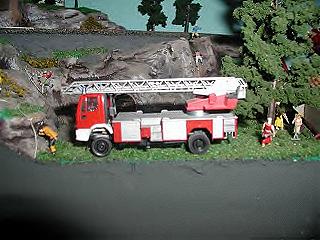 Thomas hatte auch einige Besonderheiten zu zeigen, so z.B. ein Leiterwagen der Feuerwehr ( Eigenbau ) mit Blinkelektronik und einen Bus mit Scheinwerfer und Rücklicht.