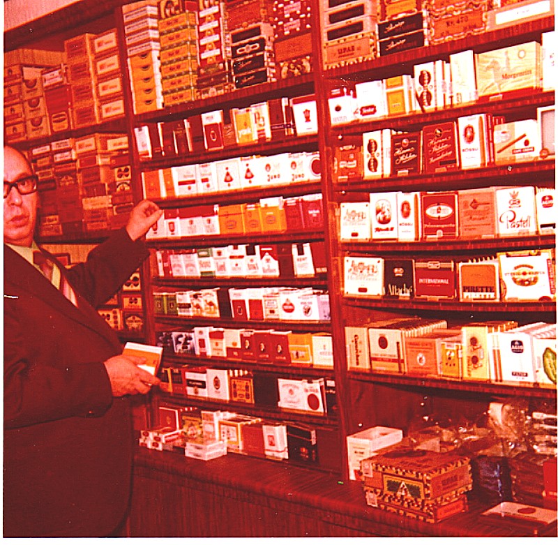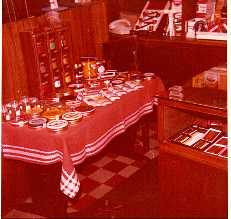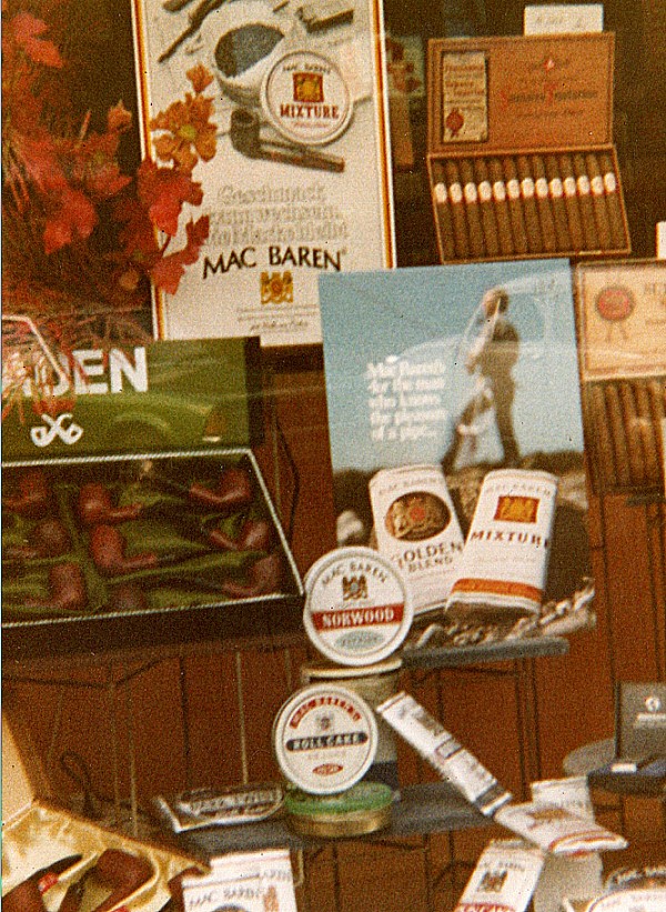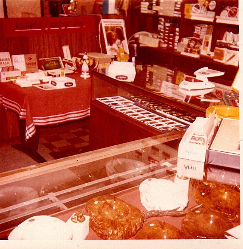 Nun möchte ich Euch einige Bilder von meinem Laden zeigen, denn ich machte etwas was es damals nur ganz selten gab, nämlich ein Proberauchen von Pfeifentabak und Zigarren, und das nannte ich Tabak-, bzw. Zigarrenbar. Die Industrie stellte mir das benötigte Material gerne kostenlos zur Verfügung und auch mein Schaufenster war dann immer auf die entsprechende Aktion dekoriert.
