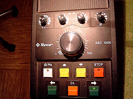 Alle Loks wurden mit dem Trafo von Roco, dem ASC 1000 gesteuert. Dieser Trafo war zu seiner Zeit allen anderen Trafos überlegen, da man mit ihm AC und DC Loks, nach Umschalten steuern konnte. Außerdem besaß dieses Gerät mehrere Einstellungsmöglichkeiten, z.B. Endgeschwindigkeit, Anfahr / Bremsverzögerung usw. Also alles Dinge die ein herkömmlicher Märklin Trafo, mit Ausnahme des Elektronikgerätes 6600, nicht konnte. Außerdem konnte man die Geschwindigkeit entweder über den großen Drehregler oder Tasten regeln. Es gab auch schon eine Notaus Taste.