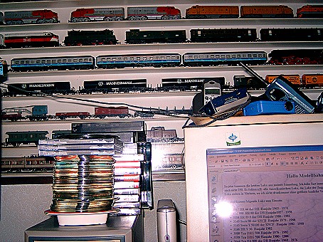 Damit der Leser meiner Seite einen kleinen Eindruck gewinnt. Dieses Bild zeigt einen kleinen Teil der Vitrine. Vor der Vitrine steht ein Eigenbau Schreibtisch von 1,10 m tiefe, wo mein Rechner, Fernseher, Videorekorder und die D-Box draufsteht. Das alles müßte ich erst einmal abräumen um dann die Front der Vitrine von unten her abzuklappen. Das werde ich demnächst einmal machen.