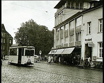 Ein weiteres Verkehrsmittel war die "Elektrische" ( Straßenbahn ) die ca. 50 Jahre lang das Stadtbild prägte. Die Straßenbahn entstand aus einer Eisenbahnverbindung von Homberg nach Moers im Jahre 1908. Diese Straßenbahnlinie bestand noch bis 1953, später verlängert bis Duisburg-Ruhrort und hat den Menschen in und um Moers geholfen mobil zu werden.